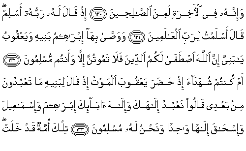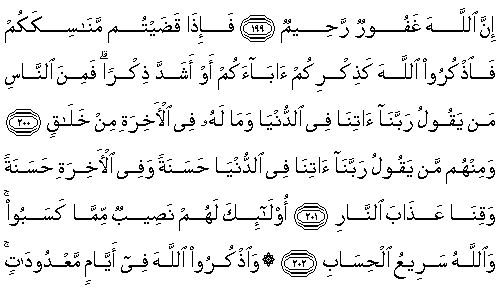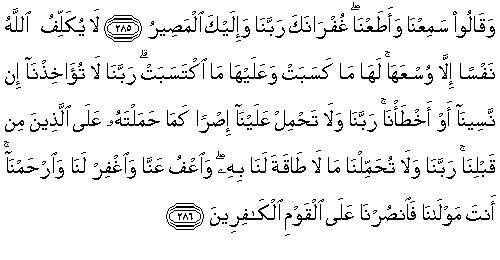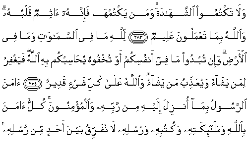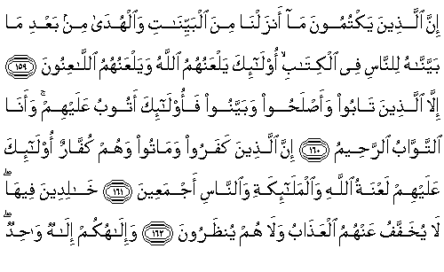 [Baqarah 2:152] Therefore remember Me, I will cause you to be spoken of and acknowledge My rights, and do not be ungrateful. Section 19 [Baqarah 2:153] O People who Believe! Seek help from patience and prayer; indeed Allah is with those who patiently endure. [Baqarah 2:154] And do not utter regarding those who are slain in Allah's cause as "dead"; in fact they are alive, but it is you who are unaware. [Baqarah 2:155] And We will surely test you with some fear and hunger, and with paucity of wealth and lives and crops; and give glad tidings to those who patiently endure. - [Baqarah 2:156] Those who say when calamity befalls them, "Indeed we belong to Allah and indeed it is to Him we are to return." [Baqarah 2:157] These are the people upon whom are the blessings from their Lord, and mercy; and it is they who are on guidance. [Baqarah 2:158] Undoubtedly Safa and Marwah * are among the symbols of Allah; so there is no sin on him, for whoever performs the Hajj (pilgrimage) of this House (of Allah) or the Umrah (lesser pilgrimage), to go back and forth between them; and whoever does good of his own accord, then (know that) indeed Allah is Most Appreciative (rewards virtue), the All Knowing. (These are 2 hillocks near the Holy Ka’aba) [Baqarah 2:159] Indeed those who hide the clear proofs and the guidance which We sent down, after We made it clear to mankind in the Book - upon them is the curse of Allah and the curse of those who curse. [Baqarah 2:160] Except those who repent and do reform and disclose (the truth) - so I will accept their repentance; and I only am the Most Acceptor of Repentance, the Most Merciful. [Baqarah 2:161] Indeed upon those who disbelieved, and died as disbelievers, is the curse of Allah and of the angels and of men combined. [Baqarah 2:162] They will remain in it forever; neither will the punishment be lightened for them, nor will they be given respite. [Baqarah 2:163] Your God is One God; there is no God except Him - the Most Gracious, the Most Merciful. Section 20 [Baqarah 2:164] Indeed in the creation of the heavens and the earth, and in the continuous alternation of night and day, and the ships which sail the seas carrying what is of use to men, and the water which Allah sends down from the sky thereby reviving the dead earth and dispersing all kinds of beasts in it, and the movement of the winds, and the obedient clouds between heaven and earth - certainly in all these are signs for the intelligent. [Baqarah 2:165] And some people create for themselves Gods (objects of worship) other than Allah, with devotion (love) equal to the devotion of Allah; and the believers do not love anybody with love equal to the love of Allah; and what will be their state, when the punishment will be before the eyes of the unjust (disbelievers)? For all power belongs wholly to Allah, and because Allah’s punishment is very severe. [Baqarah 2:166] (The day) when the leaders will be disgusted with their followers - and they shall see their punishment, and all their links will be cut off. [Baqarah 2:167] And the followers will say, "If we were to return (to earth), we would break off from them like they have broken off from us"; this is how Allah will show them their deeds as despair for them; and they will never come out from the fire (hell). Section 21 [Baqarah 2:168] O mankind! Eat from what is lawful and clean in the earth; and do not follow the footsteps of the devil; undoubtedly he is your open enemy. [Baqarah 2:169] For he will only instruct you towards evil and the shameful, and that you fabricate matters concerning Allah, what you do not know. [Baqarah 2:170] And when it is said to them, "Follow what Allah has sent down", they say, "On the contrary, we shall follow what we found our forefathers upon"; What! Even if their forefathers do not have intelligence, or guidance?! [Baqarah 2:171] And the example of the disbelievers is similar to one who calls upon one that hears nothing except screaming and yelling; deaf, dumb, blind - so they do not have sense. [Baqarah 2:172] O People who Believe! Eat of the good things We have provided you, and be grateful to Allah if it is only Him you worship. [Baqarah 2:173] He has forbidden for you only the carrion, and blood, and flesh of swine, and the animal that has been slaughtered while proclaiming the name of anyone other than Allah; so there is no sin on him who is compelled and does not eat out of desire, nor eats more than what is necessary; indeed Allah is Oft Forgiving, Most Merciful. [Baqarah 2:174] Those who hide the Book sent down by Allah and exchange it for an abject price - they only fill their bellies with fire and Allah will not speak to them on the Day of Resurrection nor will He purify them; and for them is a painful punishment. [Baqarah 2:175] They are the people who purchased error in exchange of guidance, and torment in exchange of pardon; so how much can they bear the fire? [Baqarah 2:176] This is because Allah has sent down the Book with the truth; and indeed those who caused disagreement in the Book are, surely, disputants in the extreme. Section 22 [Baqarah 2:177] Basic virtue is not just to turn faces to the East and the West, but true righteousness is that one must believe in Allah and the Last Day and the angels and the Book and the Prophets; and out of love for Allah, to give treasured wealth to relatives and to the orphans and the needy and the traveller, and to those who ask, and to set slaves free; and to keep the prayer established and to pay the charity; and those who fulfil their obligations when they make an agreement; and the patient during times of calamity, in hardships and during holy war; it is they who have proved true to their word; it is they who are the pious. [Baqarah 2:178] O People who Believe! Retribution is made obligatory for you in the matter of those killed unjustly; a freeman for a freeman, and a slave for a slave, and a female for a female; and for him who is partly forgiven by his brot