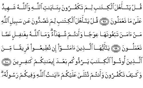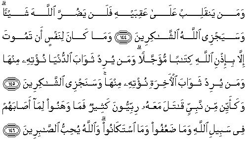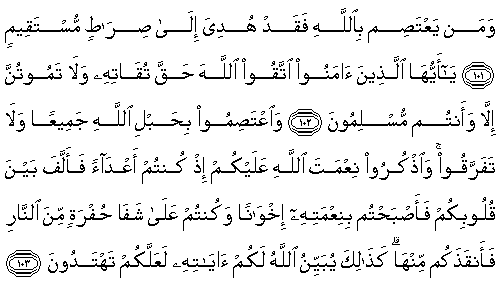 [A/I`mran 3:1] Alif-Laam-Meem. (Alphabets of the Arabic language; Allah and to whomever He reveals, know their precise meanings.) [A/I`mran 3:2] Allah - None is worthy of worship, except Him, He is Alive (eternally, on His own) and the Upholder (keeps others established). [A/I`mran 3:3] He has sent down to you (O dear Prophet Mohammed - peace and blessings be upon him) this true Book (the Holy Qur’an), confirming the Books before it, and He sent down the Taurat (Torah) and the Injeel (Bible). - [A/I`mran 3:4] Before this, a guidance to mankind; and sent down the Judgement (Criterion to judge between right and wrong); indeed for those who disbelieved in the verses of Allah, is a severe punishment; and Allah is the Almighty, the Avenger (of the wrong). [A/I`mran 3:5] Indeed nothing is hidden from Allah, neither in the earth nor in the heavens. [A/I`mran 3:6] It is He Who fashions (moulds) you in your mothers’ wombs as He wills; none is worthy of worship except Him, the Almighty (the Most Honourable), the Wise. [A/I`mran 3:7] It is He Who has sent down to you (O dear Prophet Mohammed - peace and blessings be upon him) this Book (the Qur’an) containing the verses that have a clear meaning - they are the core of the Book - and other verses the meanings of which are indistinct; those in whose hearts is deviation pursue the verses having indistinct meanings, in order to turmoil and seeking its (wrongful) interpretation; and only Allah knows its proper interpretation; and those having sound knowledge say, “We believe in it, all of it is from our Lord”; and none accept guidance except the men of understanding. [A/I`mran 3:8] “Our Lord! Do not deviate our hearts after You have guided us, and bestow mercy on us from Yourself; indeed You only are the Great Bestower.” [A/I`mran 3:9] “Our Lord! Indeed You will gather all mankind for a Day of which there is no doubt"; indeed Allah’s promise does not change. Section 2 [A/I`mran 3:10] Indeed for those who disbelieve, neither their wealth nor their offspring will help to save them in the least from Allah; and it is they who are fuel for the fire. [A/I`mran 3:11] Like the way of Firaun’s people, and those before them; they denied Our signs; so Allah seized them because of their sins; and Allah’s punishment is severe. [A/I`mran 3:12] Say (O dear Prophet Mohammed -peace and blessings be upon him) to the disbelievers, “Very soon you shall be overcome and driven towards hell, and that is a wretched resting-place.” [A/I`mran 3:13] Indeed there was a sign for you in the two groups that clashed; one army fighting in Allah's cause, against the other of disbelievers, whom they (the Muslims) saw with their eyes, as twice their own number; and Allah strengthens with His help whomever He wills; indeed in this is a lesson for the intelligent, to be learnt by observing. [A/I`mran 3:14] Beautified is for mankind the love of these desires - women, and sons, and heaps of gold and piled up silver, and branded horses, and cattle and fields; this is the wealth of the life of this world; and it is Allah, with Whom is the excellent abode. [A/I`mran 3:15] Say (O dear Prophet Mohammed - peace and blessings be upon him), “Shall I inform you of something better than that? For the pious, with their Lord, are Gardens beneath which rivers flow - they will abide in it forever - and pure wives, and Allah’s pleasure”; and Allah sees the bondmen. [A/I`mran 3:16] Those who say, “Our Lord! we have accepted faith, so forgive us our sins and save us from the punishment of fire.” [A/I`mran 3:17] The steadfast, and the truthful, and the reverent, and who spend in Allah's cause, and who seek forgiveness in the last hours of the night (before dawn). [A/I`mran 3:18] Allah has given witness that there is none worthy of worship (God) except Him - and the angels and the scholars also give witness, established with justice (with truth) - there is no God except Him, the Almighty, the Wise. [A/I`mran 3:19] Indeed the only true religion in the sight of Allah is Islam; those who had received the Books differed only after the knowledge came to them, due to their hearts’ envy; and whoever disbelieves in the signs of Allah, then Allah is Swift At Taking Account. [A/I`mran 3:20] Then if they argue with you, (O dear Prophet Mohammed - peace and blessings be upon him) say, “I have submitted my face (self) to Allah and likewise have my followers”; and say to the People given the Book(s) and the illiterate, “Have you submitted (accepted Islam)?” If they submit, they have attained the right path - and if they turn away (reject), then your duty is only to convey this command; and Allah is seeing the bondmen. Section 3 [A/I`mran 3:21] Those who disbelieve in the signs of Allah, and wrongfully martyr the Prophets, and slay people who enjoin justice - so give them the glad tidings of a painful punishment. [A/I`mran 3:22] They are those whose deeds are wasted in this world and in the Hereafter; and they do not have any aides. [A/I`mran 3:23] Did you not see them who have received a part of the Book - when called towards the Book of Allah for judging between them, a group of them opposes it and turns away? [A/I`mran 3:24] They dared to do this because they say, “The fire will definitely not touch us except for a certain number of days”; and they are deceived in their religion by the lies they fabricated. [A/I`mran 3:25] So what will be (their state) when We bring all of them together for the Day (of Resurrection) of which there is no doubt; and every soul will be paid back in full for what it has earned, and they will not be wronged. [A/I`mran 3:26] Invoke (O dear Prophet Mohammed - peace and blessings be upon him), “O Allah! Owner Of The Kingdom - You bestow the kingdom on whomever You will, and You take back the kingdom from whomever You will; and You give honour to whomever You will, and You humiliate whomever You will; only in Your hand lies all goodness; indeed, Y