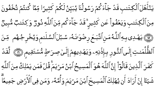 [Maidah 5:49] And therefore, O Muslims, judge between them according to what is sent down by Allah, and do not follow their desires, and be cautious of them so that they may not divert you from some commands which have been sent down to you; then if they turn away, know that Allah’s will is to punish them for some of their sins; and indeed many men are disobedient. [Maidah 5:50] So do they wish a judgement of ignorance? And whose judgement is better than that of Allah, for the people who are certain? Section 8 [Maidah 5:51] O People who Believe! Do not make the Jews and the Christians your friends; they are friends of one another; and whoever among you befriends them, is one of them; indeed Allah does not guide the unjust. [Maidah 5:52] You will now see those in whose hearts is a disease, that they rush towards the Jews and the Christians, saying, “We fear that a misfortune will possibly befall us”; so it is likely that Allah may soon bring victory, or a command from Himself, so they will remain regretting what they had hidden in their hearts. [Maidah 5:53] And the believers say, “Are these the ones who swore by Allah most vehemently in their oaths, that they are with you?” All their deeds are destroyed, so they are ruined. [Maidah 5:54] O People who Believe! Whoever among you reneges from his religion, so Allah will soon bring a people who are His beloved ones and Allah is their beloved, lenient with the Muslims and stern towards disbelievers - they will strive in Allah’s cause, and not fear the criticism of any accuser; this is the Allah’s munificence, He may give to whomever He wills; and Allah is the Most Capable, the All Knowing. [Maidah 5:55] You do not have any friends except Allah and His Noble Messenger and the believers who establish the prayer and pay the charity, and are bowed down before Allah. [Maidah 5:56] And whoever takes Allah and His Noble Messenger and the Muslims as friends - so undoubtedly only the party of Allah is victorious. Section 9 [Maidah 5:57] O People who Believe! Those who have made your religion a mockery and a sport, and those who received the Book before you, and the disbelievers - do not befriend any of them; and keep fearing Allah, if you have faith. [Maidah 5:58] And when you call to prayer, they mock and make fun of it; this is because they are people without any sense. [Maidah 5:59] Say, “O People given the Book(s)! What do you dislike in us - except that we believe in Allah and what is sent down to us and what was sent down before, and because most of you are disobedient?” [Maidah 5:60] Say, “Shall I tell you of those who are in a worse position than this, in Allah’s sight? It is those whom Allah has cursed and has wreaked His wrath upon and turned some of them into apes and swine, and worshippers of the devil; theirs is a worse destination and they have wandered further astray from the Straight Path.” [Maidah 5:61] And when they come to you, they say, “We are Muslims” whereas they were disbelievers when they came in, and disbelievers when they went out; and Allah knows very well, what they hide. [Maidah 5:62] And you will see many of them rushing towards sin and oppression, and to devour the forbidden; undoubtedly what they do is extremely evil. [Maidah 5:63] Why do not their priests and monks forbid them from speaking evil and devouring the forbidden? Undoubtedly what they do is extremely evil. [Maidah 5:64] And the Jews said, “Allah’s hand* is tied"; may their hands be tied - and they are accursed for saying so! In fact, both His hands * are free, He bestows upon whomever He wills; and O dear Prophet, this Book which has been sent down upon you from your Lord will cause many of them to advance in their rebellion and disbelief; and We have instilled enmity and hatred between them till the Day of Resurrection; whenever they ignite the flame of war, Allah extinguishes it, and they strive to create chaos in the land; and Allah does not love the mischievous. (* This is a metaphor used to express Allah’s power). [Maidah 5:65] If the People given the Book(s) had accepted faith and been pious, We would have certainly redeemed them of their sins and would have certainly taken them into serene Gardens. [Maidah 5:66] And had they kept the Taurat and the Injeel established, and what was sent down towards them from their Lord, they would have received sustenance from above and from beneath their feet; among them is a group who is fair; but most of them commit extremely evil deeds. Section 10 [Maidah 5:67] O Noble Messenger (Prophet Mohammed - peace and blessings be upon him)! Convey all what has been sent down upon you from your Lord; and if you do not, then you have not conveyed any of His messages; and Allah will protect you from the people; indeed Allah does not guide the disbelievers. [Maidah 5:68] Say, “O People given the Book(s)! You are nothing until you establish the Taurat and the Injeel, and what was sent down towards you from your Lord”; and this Book which has been sent down upon you from your Lord will cause many of them to advance in their rebellion and disbelief; so do not at all grieve for the disbelievers. [Maidah 5:69] Indeed those who call themselves Muslims - and similarly among the Jews, and the Sabeans, and the Christians * - whoever sincerely accepts faith in Allah and the Last Day, and does good deeds - so there shall be no fear upon them nor shall they grieve. (Whoever among them converts to Islam). [Maidah 5:70] We made a covenant with the Descendants of Israel and sent Noble Messengers towards them; whenever a Noble Messenger came to them with whatever was not according to their own desires, they denied some of them and some they slew. [Maidah 5:71] And they assumed that there will be no punishment, so they turned blind and deaf - then Allah accepted their penance, then again many of them turned blind and deaf; and Allah is seeing their deeds. [Maidah 5:72] They are certainly disbelievers who 