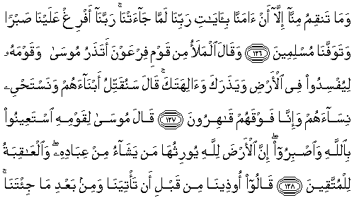 people in the graves can hear the speech of those who are on earth.) Section 12 [Aa`raf 7:94] And never did We send any Prophet to a dwelling but We seized its people with hardship and adversity so that they may become humble. [Aa`raf 7:95] Then We changed the misfortune into prosperity to the extent that they became numerous and said, "Indeed grief and comfort did reach our ancestors" - so We seized them suddenly in their neglect. [Aa`raf 7:96] And had the people of the dwellings believed and been pious, We would have surely opened for them the blessings from the sky and from the earth, but in fact they denied, and We therefore seized them on account of their deeds. [Aa`raf 7:97] Do the people of the dwellings not fear that Our wrath may come upon them at night while they are asleep? [Aa`raf 7:98] Or do the people of the dwellings not fear that Our wrath may come upon them during the day, while they are playing? [Aa`raf 7:99] Are they oblivious to Allah’s secret plan? So none is unafraid of Allah’s secret plan except the people of ruin! Section 13 [Aa`raf 7:100] Or did not those who inherited the land after its owners, get enough guidance that if We will, We can afflict them with calamity for their sins? And We set seals upon their hearts so they do not hear. [Aa`raf 7:101] These are the dwellings - the affairs of which We relate to you (Prophet Mohammed - peace and blessings be upon him); and indeed their (respective) Noble Messengers came to them with clear proofs; so they were not able to believe in what they had denied before; this is how Allah sets seals upon the hearts of disbelievers. [Aa`raf 7:102] And We found most of them not true to their words; and indeed We found most of them disobedient. [Aa`raf 7:103] Then after them, We sent Moosa with our signs to Firaun and his court members, but they did injustice to those signs; therefore see what sort of fate befell the mischievous! [Aa`raf 7:104] And Moosa said, "O Firaun! Indeed I am a Noble Messenger from the Lord Of The Creation." [Aa`raf 7:105] "It is obligatory for me not to speak concerning Allah except the truth; I have come to you all with a clear sign from your Lord, therefore let the Descendants of Israel go with me." [Aa`raf 7:106] Said Firaun, "If you have come with a sign, then present it if you are truthful!" [Aa`raf 7:107] Therefore Moosa put down his staff - it immediately turned into a visible python. [Aa`raf 7:108] And putting his hand in his bosom, withdrew it - so it shone brightly before the beholders. Section 14 [Aa`raf 7:109] Said the chieftains of Firaun’s people, "He is really an expert magician." [Aa`raf 7:110] "He wishes to expel you all from your kingdom; so what do you advise?" [Aa`raf 7:111] They said, "Stop him and his brother, and send announcers to the cities to gather people." [Aa`raf 7:112] "To bring all the expert magicians to you." [Aa`raf 7:113] And the magicians came to Firaun, and said, "Will we get some reward if we are victorious?" [Aa`raf 7:114] He said, "Yes, and you will then become close to me." [Aa`raf 7:115] They said, "O Moosa! You may throw first - or shall we be the first to throw?" [Aa`raf 7:116] He said, "You throw"; when they threw, they cast a magic spell upon the people’s eyes and terrified them, and they brought a great magic. [Aa`raf 7:117] And We inspired Moosa that, "Put forth your staff"; it immediately began swallowing up their fabrications. [Aa`raf 7:118] So the truth was proved and their works were disproved. [Aa`raf 7:119] They were therefore defeated here and they turned back humiliated. [Aa`raf 7:120] And the magicians were obliged to fall prostrate. [Aa`raf 7:121] They said, "We have accepted faith in the Lord Of The Creation." [Aa`raf 7:122] "The Lord of Moosa and Haroon." [Aa`raf 7:123] Said Firaun, "You have accepted faith in Him before I gave you permission! This is indeed a grand conspiracy you have plotted in the city, in order to expel its people from it; so now you will come to know!" [Aa`raf 7:124] "I swear I will cut off your hands and your feet from alternate sides and then crucify you all." [Aa`raf 7:125] They said, "We shall return to our Lord." [Aa`raf 7:126] "And what did you dislike in us, except that we believed in the signs of our Lord when they came to us? Our Lord! Pour (bestow abundantly) patience on us, and bestow us death as Muslims." Section 15 [Aa`raf 7:127] The chieftains of Firaun’s people said, "Are you releasing Moosa and his people to cause turmoil in the land, and for Moosa to abandon you and your appointed deities?" He said, "We shall now slay their sons and spare their women; and indeed we have power over them." [Aa`raf 7:128] Moosa said to his people, "Seek the help of Allah and patiently endure; indeed the Owner of the earth is Allah - He appoints as its successor whomever He wills; and the final triumph is for the pious." [Aa`raf 7:129] They said, "We have been oppressed before you came to us, and after you have come to us"; he said, "It is likely that your Lord may destroy your enemy and in his place make you the rulers of the earth, and then see what deeds you perform." [Aa`raf 7:130] And indeed We seized the people of Firaun with a famine of several years and with reduction of fruits, so that they may follow advice. Section 16 [Aa`raf 7:131] So when good would reach them they would say, "This is for us"; and when misfortune reached them, they would infer it as ill omens of Moosa and his companions; pay heed! The misfortune of their ill luck lies with Allah, but most of them are unaware. [Aa`raf 7:132] And said, "You may come with any sign to us, in order to cast a magic spell on us - yet by no means are we going to believe in you." [Aa`raf 7:133] We therefore sent against them the flood and the locusts and the vermin (or insects) and the frogs and the blood - separate signs; in response they were proud and were a guilty people. [Aa`raf 7:134] And whenever the punishment came upon them they said, "O Moosa! Pray to you