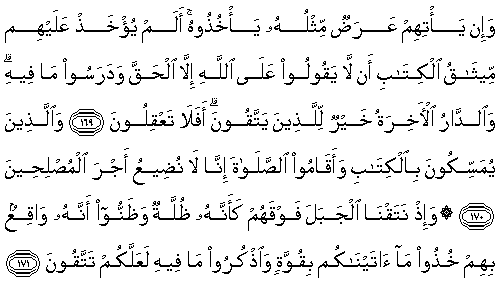 blessings be upon him – is part of faith. To disrespect him is blasphemy.) Section 20 [Aa`raf 7:158] Say (O dear Prophet Mohammed - peace and blessings be upon him), "O people! Indeed I am, towards you all, the Noble Messenger of Allah - for Whom (Allah) only is the kingship of the heavens and the earth; there is none worthy of worship, except Him - giving life and giving death; therefore believe in Allah and His Noble Messenger, the Prophet who is untutored (except by Allah), who believes in Allah and His Words, and obey him (the Prophet) to attain guidance." (Prophet Mohammed – peace and blessings be upon him – is the Prophet towards all mankind.) [Aa`raf 7:159] And among the people of Moosa is a group that shows the true path, and establishes justice with it. [Aa`raf 7:160] And We divided them into twelve tribes, as separate groups; and when his people asked him for water, We revealed to Moosa, "Strike the rock with your staff"; so twelve springs gushed forth from it; each group recognised its drinking-place; and We made the clouds a canopy over them and sent down the Manna and the Salwa (birds) on them; "Eat of the good things we have provided you"; and they did not wrong Us in the least, but they used to wrong themselves. [Aa`raf 7:161] And remember when they were commanded, "Reside in this township and eat whatever you wish in it, and say ‘Sins are forgiven’ and enter the gate prostrating - We will forgive you your sins; We shall soon bestow more upon the virtuous." [Aa`raf 7:162] So the unjust among them changed the words, contrary to what they had been commanded - consequently We sent down upon them a punishment from the sky - the recompense of their injustice. Section 21 [Aa`raf 7:163] And ask them (O dear Prophet Mohammed - peace and blessings be upon him) of the township that was by the sea; when they used to exceed in the matter of the Sabbath - when their fish used to come swimming atop the water in front of them on the day of Sabbath and not come on the days it was not Sabbath; this is how We used to test them, due to their disobedience. [Aa`raf 7:164] And when a group among them said, "Why do you preach to a people whom Allah is going to destroy or mete out a severe punishment?" They said, "To have an excuse before your Lord, and that perhaps they may fear." [Aa`raf 7:165] And when they forgot the advices they had been given, We rescued those who forbade evil, and seized the unjust with a dreadful punishment - the recompense of their disobedience. [Aa`raf 7:166] Consequently when they rebelled against the command to refrain, We said to them, "Be apes, despised!" [Aa`raf 7:167] And remember when your Lord announced the command that till the Day of Resurrection I will certainly send such oppressors against them, who will inflict them with a dreadful punishment; indeed your Lord is swift in meting out punishment; and indeed He is Oft Forgiving, Most Merciful. [Aa`raf 7:168] And We divided them in the earth as separate groups; some of them are righteous and some are the other type; and We tested them with good (favours) and evil things (adversities) so that they may return. [Aa`raf 7:169] And after them in their place, came those unworthy successors who inherited the Books - they accept the goods of this world (as bribes) and say, "We shall soon be forgiven"; and if similar goods come to them again, they would accept it; was not the covenant taken from them in the Book, that they must not relate anything to Allah except the truth, and they have studied it? And indeed the abode of the Hereafter is better for the pious; so do you not have sense? [Aa`raf 7:170] And those who hold fast to the Book, and kept the prayer established; and We do not waste the wages of the righteous. [Aa`raf 7:171] And when We raised the Mount (Sinai) above them as if it were a canopy, and they thought that it would fall upon them; "Accept firmly what We have given you, and remember what is in it, so that you may become pious." Section 22 [Aa`raf 7:172] And remember when your Lord brought forth the generations from the backs of the Descendants of Adam, and made them their own witness; "Am I not your Lord?"; they all said, "Yes surely You are, why not? We testify"; for you may say on the Day of Resurrection that, "We were unaware of this." [Aa`raf 7:173] Or you may say, "It is our ancestors who first ascribed partners (to Allah) and we were (their) children after them; so will You destroy us on account of the deeds of the followers of falsehood?" [Aa`raf 7:174] And this is how We explain the verses in different ways, and so that they may return. [Aa`raf 7:175] And O dear Prophet (Mohammed - peace and blessings be upon him) recite to them the case of the one to whom We gave Our revelations, and in response he departed from them completely - so Satan went after him - he therefore became of the astray. [Aa`raf 7:176] And had We willed We could have raised him because of the revelations, but he clung to the earth and followed his own desires; his condition therefore is like that of a dog; if you attack him he hangs out his tongue and if you leave him he hangs out his tongue; this is the state of the people who denied Our signs; therefore preach, so that they may give thought. [Aa`raf 7:177] What an evil example is of those who denied Our signs and used to wrong only their own souls. [Aa`raf 7:178] Whomever Allah guides - only he is on the right path; and whomever He sends astray - it is they who are the losers. [Aa`raf 7:179] And indeed We have created many jinns and men for hell; they have hearts in which their is no understanding; and the eyes they do not see with; and the ears they do not hear with; they are like cattle - in fact more astray; it is they who are the neglectful. [Aa`raf 7:180] And for Allah only are the best names, so invoke Him by them; and abandon those who depart from the truth regarding His names; they will soon receive the reward of their deeds. [Aa`raf 7:181] And from Our cr