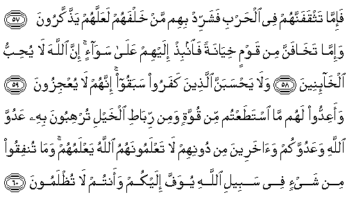 PART 10 [Anfal 8:41] And know that whatever you take as war booty, a fifth of that belongs to Allah and His Noble Messenger, and to relatives, and orphans, and the needy, and the traveller - if you have accepted faith in Allah and what We sent down to Our bondman on the decisive day - the day when two armies had met; and Allah is Able to do all things. [Anfal 8:42] When you were on the near bank and the disbelievers on the far bank, and the caravan below you; and had you made an agreement between one another, you would have failed to reach on the appointed time - but this is in order that Allah may complete a thing that must be done - that he who dies may die by a clear proof and he who lives may live by a clear proof; and indeed Allah is surely, All Hearing, All Knowing. [Anfal 8:43] When O dear Prophet, Allah used to show the disbelievers in your dream as only a few *; and O Muslims, had He shown them to you as many, you would have certainly lost courage and disputed over the affair, but Allah rescued (you); indeed He knows what lies within the hearts. (* They numbered more but their actual strength was equal to only a few.) [Anfal 8:44] And when at the time of fighting He made the disbelievers seem few to you, and you as few in their sight, in order for Allah to conclude the matter that must be done; and towards Allah is the return of all matters. Section 6 [Anfal 8:45] O People who Believe! When you meet an army, hold firm and remember Allah profusely, in order that you succeed. [Anfal 8:46] And obey Allah and His Noble Messenger, and do not dispute with one another for you will lose courage again and your strength will be lost, and patiently endure; indeed Allah is with those who patiently endure. [Anfal 8:47] And do not be like those who came out from their houses proudly, and to be seen by men, and they prevent people from Allah’s way; and all their actions are within Allah’s control. Section 7 [Anfal 8:48] And when Satan made their deeds seem good in their sight and said, "This day no one can overpower you, and you are under my protection"; so when the two armies came face to face, he scrambled back and said, "I am unconcerned with you - I can see what is not visible to you - I fear Allah"; and Allah’s punishment is severe. [Anfal 8:49] When the hypocrites and those in whose hearts is a disease were saying, "These Muslims are proud of their religion"; and whoever trusts Allah, then indeed Allah is Almighty, Wise. [Anfal 8:50] And if you see the angels when they are removing the souls of the disbelievers, hitting them on their faces and their backs; "Taste more of the punishment of the fire!" (Punishment in the grave is proven by this verse.) [Anfal 8:51] "This is the recompense of what your own hands have sent ahead, and Allah does not oppress His bondmen." [Anfal 8:52] Like the ways of Firaun’s people, and those before them; they disbelieved in the signs of Allah - therefore Allah seized them on account of their sins; indeed Allah is Most Powerful, Severe in Punishing. [Anfal 8:53] This is because Allah does not change the favour He has bestowed upon any people until they first change themselves, and indeed Allah is All Hearing, All Knowing. [Anfal 8:54] Like the ways of Firaun’s people and those before them; they denied the signs of Allah - We therefore destroyed them on account of their sins and We drowned the people of Firaun; and they all were unjust. [Anfal 8:55] Indeed the worst beasts in the sight of Allah are the people who disbelieve and do not accept faith. [Anfal 8:56] Those with whom you made a treaty, then they break their agreement each time and do not fear. [Anfal 8:57] So if you find them in battle, kill them in a manner which makes those behind them scamper back, in the hope that they may learn a lesson. [Anfal 8:58] And if you apprehend treachery from a nation, then throw back their treaty towards them in reciprocity; indeed Allah does not like the treacherous. Section 8 [Anfal 8:59] And never may the disbelievers pride that they been able to run away; indeed they can never defeat. [Anfal 8:60] And keep ready for them the maximum of forces you can and the maximum number of horses you can keep tethered, in order to instil awe in the hearts of those who are the enemies of Allah and who are your enemies, and in the hearts of some others whom you do not know; Allah knows them; and whatever you spend in Allah's cause will be repaid to you in full and you will never be in a loss. [Anfal 8:61] And if they incline towards peace, you too lean towards it, and trust Allah; indeed He only is the All Hearing, the All Knowing. [Anfal 8:62] And if they wish to deceive you, then indeed Allah is Sufficient for you; it is He Who has given you strength, with His help and with the Muslims. [Anfal 8:63] And has created harmony among their hearts; if you had spent all that is in the earth you could not have created harmony among their hearts, but Allah has created harmony among them; indeed He only is Almighty, Wise. [Anfal 8:64] O Herald of the Hidden! Allah is Sufficient for you and for all these Muslims who follow you. Section 9 [Anfal 8:65] O Herald of the Hidden! Urge the believers to fight; if there are twenty persevering men among you, they shall overcome two hundred; and if there are a hundred among you, they shall overcome a thousand disbelievers because the disbelievers are a people who do not have sense. [Anfal 8:66] So now Allah has made an easing upon you and He knows that you are weak; so if there are a hundred persevering men among you, they shall overcome two hundred; and if there are a thousand among you, they shall overcome two thousand by the command of Allah; and Allah is with those who patiently endure. [Anfal 8:67] It does not befit any Prophet to capture the disbelievers alive until he has profusely shed their blood in the land; you people desire the wealth of this world; and Allah wills the Hereafter, and Allah is Almighty, Wise. [Anfal 8:68] Had Al