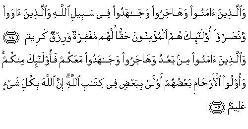 [Anfal 8:1] They ask you O dear Prophet (Mohammed - peace and blessings be upon him) concerning the war booty; say, "Allah and the Noble Messenger are the owners of the war booty; so fear Allah and maintain friendship among yourselves; and obey Allah and His Noble Messenger, if you have faith." [Anfal 8:2] Only they are the believers whose hearts fear when Allah is remembered, and their faith advances when His verses are recited to them, and who trust only in their Lord. [Anfal 8:3] Those who keep the prayer established and spend in Our cause from what We have bestowed upon them. [Anfal 8:4] These are the true Muslims; for them are ranks before their Lord, and forgiveness and an honourable sustenance. [Anfal 8:5] The way your Lord caused you, O dear Prophet to come forth from your home with the truth; and indeed a group of Muslims were unhappy about it. [Anfal 8:6] Disputing with you regarding the truth after it had been made clear, as if they were being herded towards a visible death. [Anfal 8:7] And remember when Allah promised you that one of the two groups (of enemies) is for you, and you wished to get the one that posed no danger, and Allah willed to prove the truth with His Words, and to cut the origins of the disbelievers. [Anfal 8:8] In order that He may prove the truth and disprove falsehood, even if the criminals get annoyed. [Anfal 8:9] When you (Prophet Mohammed - peace and blessings be upon him) were seeking the help of your Lord, so He answered your prayers that, "I will help you with a row of thousands of angels." [Anfal 8:10] And Allah did this just for your happiness and for your hearts to gain contentment; and help does not come except from Allah; indeed Allah is Almighty, Wise. Section 2 [Anfal 8:11] When He made the slumber overcome you, so it was as a peacefulness from Him, and sent down water from the sky upon you to purify you with it, and to remove the impurity of Satan from you, and to give your hearts fortitude and firmly establish your feet with it. [Anfal 8:12] And when O dear Prophet, your Lord was inspiring the angels that, "I am with you - so make the believers stand firm; I will soon instil fear into the hearts of the disbelievers, so strike above the disbelievers’ necks and hit their each and every bone joint." [Anfal 8:13] This is because they opposed Allah and His Noble Messenger; and whoever opposes Allah and His Noble Messenger - then indeed Allah’s punishment is severe. [Anfal 8:14] Therefore taste this for now, and along with it for the disbelievers is the punishment of fire. [Anfal 8:15] O People who Believe! When you confront a large army of disbelievers in battle, do not turn your backs to them. [Anfal 8:16] And on that day whoever turns his back to them, except for a battle strategy or to join one’s own company, has then turned towards Allah’s wrath, and his destination is hell; and what an evil place of return is hell! [Anfal 8:17] So you did not slay them, but in fact Allah slew them; and O dear Prophet (Mohammed - peace and blessings be upon him) you did not throw (the sand) when you did throw, but in fact Allah threw; and in order to bestow an excellent reward upon the Muslims; indeed Allah is the All Hearing, the All Knowing. [Anfal 8:18] Therefore take this, and (know that) Allah will weaken the scheme of the disbelievers. [Anfal 8:19] O disbelievers! If you seek a judgement, then this judgement has come to you; and if you desist, it is better for you; and if you return to mischief, We will punish you again; and your populace will not benefit you, however large it may be - and besides this, Allah is with the Muslims. Section 3 [Anfal 8:20] O People who Believe! Obey Allah and His Noble Messenger, and do not turn away from him after you have heard him speak. [Anfal 8:21] And do not be like those who said, "We have heard", whereas they do not hear. [Anfal 8:22] Indeed the worst beasts in the sight of Allah are those (people) who are deaf, dumb - who do not have any sense. [Anfal 8:23] And had Allah found any goodness in them, He would have made them hear; and had He made them hear they would, in the end, have turned away and gone back. [Anfal 8:24] O People who Believe! Present yourselves upon the command of Allah and His Noble Messenger, when the Noble Messenger calls you towards what will bestow you life; and know that the command of Allah becomes a barrier between a man and his heart’s intentions, and you will all be raised towards Him. [Anfal 8:25] And fear the turmoil which will certainly not fall only upon a few selected unjust people among you; and know that Allah’s punishment is severe. [Anfal 8:26] And remember when you were only a few and meek in the land, and feared that men may snatch you away - He therefore gave you refuge and strengthened you with His help, and gave you good things as sustenance, so that you may be thankful. [Anfal 8:27] O People who Believe! Do not betray Allah and His Noble Messenger, nor purposely defraud your trusts. [Anfal 8:28] And know that your wealth and your children are a test, and that with Allah is an immense reward. Section 4 [Anfal 8:29] O People who Believe! If you fear Allah, He will bestow upon you (the criterion) that with which you will separate the truth from falsehood, and He will unburden your misdeeds and forgive you; and Allah is the Extremely Munificent. [Anfal 8:30] And remember O dear Prophet when the disbelievers were scheming against you to either imprison you, or to kill you or to banish you; and they were scheming, and Allah was making His secret plan; and Allah’s secret plan is the best. [Anfal 8:31] And when Our verses are recited to them they say, "Yes, we have heard - if we wanted we could also say something like this - these are nothing but stories of former people!" [Anfal 8:32] And when they said, "O Allah! If this (the Qur’an) is really the truth from You, then shower upon us a rain of stones from the sky, or bring upon us some painful punishment." [Anfal 