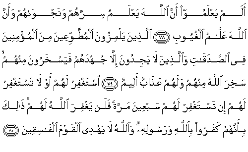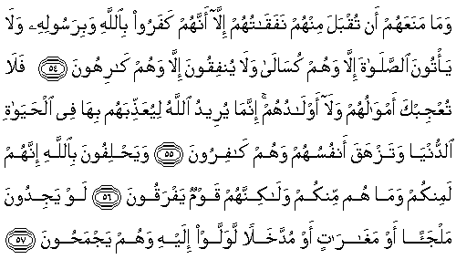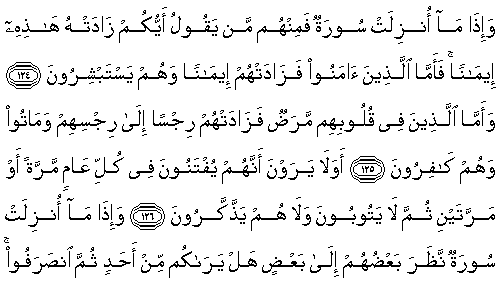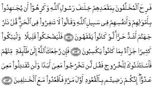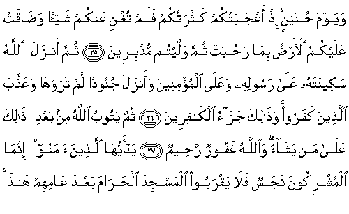 [Taubah 9:1] Severance of ties is proclaimed by Allah and on behalf of His Noble Messenger, towards the polytheists with whom you had a treaty. [Taubah 9:2] Travel freely in the land for four months, and bear in mind that you cannot escape from Allah, and that Allah will humiliate the disbelievers. [Taubah 9:3] And proclaim from Allah and His Noble Messenger to all men on the day of the Great Pilgrimage (Haj) that Allah is disgusted with the polytheists, and so is His Noble Messenger; so if you repent it is better for you; but if you turn away, then know that you cannot escape from Allah; and give the disbelievers the glad tidings of a painful punishment. [Taubah 9:4] Other than those polytheists with whom you had a treaty, and they have not diminished anything from your treaty nor supported anyone against you - therefore fulfil their treaty up to the appointed term; indeed Allah befriends the pious. [Taubah 9:5] Then when the sacred months have passed, slay the polytheists wherever you find them, and catch them and make them captive, and wait in ambush for them at every place; then if they repent and keep the prayer established and pay the charity, leave their way free; indeed Allah is Oft Forgiving, Most Merciful. [Taubah 9:6] And O dear Prophet (Mohammed - peace and blessings be upon him), if a polytheist seeks your protection, give him protection so that he may hear the Word of Allah, and then transport him to his place of safety; this is because they are an unwise people. Section 2 [Taubah 9:7] How can there be a treaty with Allah and with His Noble Messenger for the polytheists, except for those with whom you made a treaty near the Sacred Mosque? So as long as they remain firm on the treaty for you, you too remain firm for them; indeed Allah is pleased with the pious. [Taubah 9:8] Therefore how - when they are such that if they gain control over you, they would not have regard for any relations nor for any treaty? They please you with their mouths whereas their hearts contain rejection; and most of them are disobedient. [Taubah 9:9] They exchanged the verses of Allah for an abject price, therefore prevented from His way; indeed what they do is extremely evil. [Taubah 9:10] In respect of the Muslims, they do not keep regard for any relations nor any pacts; it is they who are the rebels. [Taubah 9:11] Then if they repent and keep the prayer established and pay the charity, they are your brothers in religion; and we explain Our verses in detail for the people of knowledge. [Taubah 9:12] And if they break their promises after making a treaty and malign your religion, then fight the leaders of disbelief - indeed their promises are nothing - in the hope that they may desist. [Taubah 9:13] Will you not fight the people who broke their promises, and intended to expel the Noble Messenger whereas they had started it? Do you fear them? So Allah has more right that you should fear Him, if you have faith. [Taubah 9:14] So fight them - Allah will punish them at your hands, and He will disgrace them and assist you over them, and He will soothe the hearts of the believers. [Taubah 9:15] And He will remove the anxiety of their hearts; and Allah may accept the repentance of whomever He wills; and Allah is All Knowing, Wise. [Taubah 9:16] Are you under the illusion that you would be left just like this, whereas Allah has not yet made known those of you who will fight and not confide their secrets with anyone except Allah and His Noble Messenger and the Muslims? And Allah is Well Aware of your deeds. Section 3 [Taubah 9:17] It does not befit the polytheists to assemble in Allah’s mosques after themselves bearing witness of their disbelief; in fact all their deeds are wasted; and they will remain in the fire forever. [Taubah 9:18] Only those enliven the mosques of Allah who believe in Allah and the Last Day and establish prayer and pay the obligatory charity and fear none except Allah - so it is likely that they will be among the people of guidance. [Taubah 9:19] So have they taken the quenching of the pilgrims’ thirst and servicing of the Sacred Mosque as equal (in merit) to him who accepted faith in Allah and the Last Day, and fought in Allah’s way? They are not equal before Allah; and Allah does not guide the unjust. [Taubah 9:20] Those who accepted faith, and left their homes and fought with their wealth and their lives in Allah’s way have a greater rank before Allah; and it is they who have succeeded. [Taubah 9:21] Their Lord gives them the glad tidings of His mercy and His pleasure, and the Gardens in which are everlasting favours for them. [Taubah 9:22] They will abide in it for ever and ever; indeed with Allah is the great reward. [Taubah 9:23] O People who Believe! Do not consider your fathers and your brothers as your friends if they prefer disbelief over faith; and whoever among you befriends them - then it is he who is the unjust. [Taubah 9:24] Say, "If your fathers, and your sons, and your brothers, and your wives, and your tribe, and your acquired wealth, and the trade in which you fear a loss, and the houses of your liking - if all these are dearer to you than Allah and His Noble Messenger and fighting in His way, then wait until Allah brings about His command; and Allah does not guide the sinful." Section 4 [Taubah 9:25] Indeed Allah helped you on many occasions - and on the day of Huneyn - when you prided in your multitude, so it did not benefit you at all, and the earth despite being vast became restricted for you - then you turned back and returned. [Taubah 9:26] Then Allah sent down His calm upon His Noble Messenger and upon the Muslims, and sent down armies you did not see, and punished the disbelievers; and such is the reward of the deniers. [Taubah 9:27] Then afterwards Allah will give repentance to whomever He wills; and Allah is Oft Forgiving, Most Merciful. [Taubah 9:28] O People who Believe! The polytheists are utterly filthy *; so after this year do not let them come