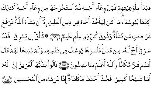 [Yusuf 12:1] Alif-Lam-Ra *; these are verses of the clear Book. (* Alphabets of the Arabic language; Allah and to whomever He reveals, know their precise meanings.) [Yusuf 12:2] Indeed We have sent down an Arabic Qur’an, so that you may perceive. [Yusuf 12:3] We relate to you the best narrative because We have sent the divine revelation of this Qur’an, to you; although surely you were unaware before this. [Yusuf 12:4] Remember when Yusuf (Joseph) said to his father, "O my father! I saw eleven stars and the sun and the moon - I saw them prostrating to me." [Yusuf 12:5] He said, "O my child! Do not relate your dream to your brothers, for they will hatch a plot against you; indeed Satan is an open enemy towards mankind." [Yusuf 12:6] "And this is how your Lord will choose you and teach you how to interpret events, and will perfect His favours upon you and upon the family of Yaqub, the way He perfected it upon both your forefathers, Ibrahim and Ishaq; indeed your Lord is All Knowing, Wise." Section 2 [Yusuf 12:7] Indeed in Yusuf and his brothers are signs * for those who enquire **. (* Of the truthfulness of Prophet Mohammed - peace and blessings be upon him. ** The Jews who enquired about their story.) [Yusuf 12:8] When they said, "Indeed Yusuf and his brother * are dearer to our father than we are, and we are one group; undoubtedly our father is, clearly, deeply engrossed in love." (* Of the same mother.) [Yusuf 12:9] "Kill Yusuf or throw him somewhere in the land, so that your father’s attention may be directed only towards you, and then after it you may again become righteous!" [Yusuf 12:10] A speaker among them said, "Do not kill Yusuf - and drop him into a dark well so that some traveller may come and take him away, if you have to." [Yusuf 12:11] They said, "O our father! What is the matter with you that you do not trust us with Yusuf, although we are in fact his well-wishers?" [Yusuf 12:12] "Send him with us tomorrow so that he may eat some fruits and play, and indeed we are his protectors." [Yusuf 12:13] He said, "I will indeed be saddened by your taking him away, and I fear that the wolf may devour him, whilst you are unaware of him." (* Prophet Yaqub knew of what was about to happen.) [Yusuf 12:14] They said, "If the wolf devours him, whereas we are a group, then surely we are useless!" [Yusuf 12:15] Then when they took him away, and all of them agreed that they should drop him in the dark well; and We sent the divine revelation to him, "You will surely tell them of their deed at a time when they will not know." [Yusuf 12:16] And at nightfall they came to their father, weeping. [Yusuf 12:17] Saying, "O our father! We went far ahead while racing, and left Yusuf near our resources - therefore the wolf devoured him; and you will not believe us although we may be truthful." [Yusuf 12:18] And they brought his shirt stained with faked blood; he said, "On the contrary - your hearts have fabricated an excuse for you; therefore patience is better; and from Allah only I seek help against the matters that you relate." [Yusuf 12:19] And there came a caravan - so they sent their water-drawer, he therefore lowered his pail; he said, "What good luck, this is a boy!"; and they hid him as a treasure; and Allah knows what they do. [Yusuf 12:20] And the brothers sold him for an improper price, a limited number of coins; and they had no interest in him. Section 3 [Yusuf 12:21] And the Egyptian who purchased him said to his wife, "Keep him honourably - we may derive some benefit due to him or we may adopt him as our son"; and this is how we established Yusuf in the land, and that We might teach him how to interpret events; and Allah is Dominant upon His works, but most men do not know. [Yusuf 12:22] And when he matured to his full strength, We bestowed him wisdom and knowledge; and this is how We reward the virtuous. [Yusuf 12:23] And the woman in whose house he was, allured him not to restrain himself and she closed all the doors - and said, "Come! It is you I address!"; he said, "(I seek) The refuge of Allah - indeed the governor is my master - he treats me well; undoubtedly the unjust never prosper." [Yusuf 12:24] And indeed the woman desired him; and he too would have desired her were he not to witness the sign of his Lord *; this is what We did, to turn away evil and lewdness from him; indeed He is one of Our chosen bondmen. (* Allah saved him and he never desired this immorality.) [Yusuf 12:25] And they both raced towards the door, and the woman tore his shirt from behind, and they both found her husband at the door; she said, "What is the punishment of the one who sought evil with your wife, other than prison or a painful torture?" [Yusuf 12:26] Said Yusuf, "It was she who lured me, that I may not guard myself" - and a witness from her own household testified; "If his shirt is torn from the front, then the woman is truthful and he has spoken incorrectly." [Yusuf 12:27] "And if his shirt is torn from behind, then the woman is a liar and he is truthful." [Yusuf 12:28] So when the governor saw his shirt torn from behind, he said, "Indeed this is a deception of women; undoubtedly the deception of women is very great." [Yusuf 12:29] "O Yusuf! Disregard this - and O woman! Seek forgiveness for your sin; indeed you are of the mistaken." Section 4 [Yusuf 12:30] And some women of the city said, "The governor’s wife is seducing her young slave; indeed his love has taken root in her heart; and we find her clearly lost." [Yusuf 12:31] And when she heard of their secret talk, she sent for them and prepared cushioned mattresses for them and gave a knife to each one of them and said to Yusuf, "Come out before them!" When the women saw him they praised him and cut their hands, and said, "Purity is to Allah - this is no human being; this is not but an honourable angel!" [Yusuf 12:32] She said, "This is he on whose account you used to insult me; and indeed I tried to entice him, so he safeguarded himself;
