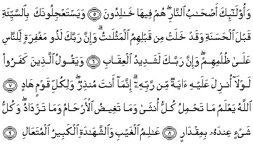 [Raad 13:1] Alif-Lam-Meem-Ra *; these are verses of the Book; and that which has been sent down upon you from your Lord is true, but most men do not believe. (* Alphabets of the Arabic language - Allah and to whomever He reveals, know their precise meanings.) [Raad 13:2] It is Allah Who raised up the heavens without columns for you to observe, then (in the manner befitting His Majesty) established Himself upon the Throne (of control), then subjected the sun and the moon; each one runs for up to an appointed term; Allah plans the works and explain the signs in detail, so that you may believe in meeting with your Lord. [Raad 13:3] And it is He Who spread out the earth and made mountains as anchors and rivers in it; and in it made all kinds of fruits in pairs - He covers the night with the day; indeed in this are signs for people who ponder. [Raad 13:4] And in the earth are various regions, and are close to each other - and gardens of grapes and fields, and date-palms, growing from a single branch and separately, all being given one water; and in fruits, We make some better than others in eating; indeed in this are signs for people of intellect. [Raad 13:5] And if you are amazed, then indeed the amazement is at their saying that, "Will we, after having turned to dust, be created anew?" They are those who have disbelieved in their Lord; and they are those who will have shackles around their necks; and they are the people of hell; remaining in it forever. [Raad 13:6] And they urge you to hasten the punishment before the mercy, whereas the punishments of those before them have concluded; and indeed your Lord gives the people a sort of pardon * despite their injustice; and indeed the punishment of your Lord is severe. (* By delaying their punishment despite their disbelief.) [Raad 13:7] The disbelievers say, "Why is not a sign sent down upon him from his Lord?" You are purely a Herald of Warning, and a guide for all nations. Section 2 [Raad 13:8] Allah knows all what is inside the womb of every female, and every increase and decrease of the wombs; and all things are with Him by a set measure. [Raad 13:9] The All Knowing of all things hidden and visible, the Great, the Supreme. [Raad 13:10] Equal * are the one among you who speaks softly and one who speaks aloud, and one who is hidden during the night and one who walks during the daytime. (* For Allah.) [Raad 13:11] For man are angels of alternating duties, in front and behind him, who guard him by Allah’s command; indeed Allah does not change His favour upon any nation until they change their own condition; and when Allah wills misfortune for a nation, it cannot be repelled; and they do not have any supporter besides Him. [Raad 13:12] It is He Who shows you the lightning, for fear and for hope, and raises the heavy clouds. [Raad 13:13] And the thunder proclaims His purity with praise, and the angels out of fear of Him; and He sends the bolt of lightning - it therefore strikes upon whom He wills, whilst they are disputing concerning Allah; and severe is His seizure. [Raad 13:14] Only the prayer to Him is truthful; and whomever they pray to besides Him, do not hear them at all, but like one who has his hands outstretched towards water that it may come into his mouth, and it will never come; and every prayer of the disbelievers remains wandering. [Raad 13:15] And to Allah only prostrate all those who are in the heavens and in the earth, willingly or helplessly - and their shadows - every morning and evening. (Command of prostration # 2). [Raad 13:16] Say (O dear Prophet Mohammed - peace and blessings be upon him), "Who is the Lord of the heavens and the earth?" Proclaim, "Allah"; Say, "So have you appointed such as supporters besides Him, who can neither benefit nor harm themselves?"; say, "Will the blind and the sighted ever be equal? Or will the realms of darkness and the light ever be equal?" Have they appointed such as partners to Allah who created something like Allah did? Therefore their creation and His creation seemed alike to them? Proclaim, "Allah is the Creator of all things, and He Alone is the Dominant over all." [Raad 13:17] He sent down water from the sky, so valleys flowed according to their measure, therefore the water flow brought forth the froth swollen upon it; and upon which they ignite the fire, to make ornaments and tools, from that too rises a similar froth; Allah illustrates that this is the example of the truth and the falsehood; the froth then bursts and disappears; and that which is of use to people, remains in the earth; this is how Allah illustrates the examples. [Raad 13:18] For those who obeyed the command of Allah is goodness and if those who did not obey Him owned all that is in the earth and in addition a similar one like it, they would give it to redeem their souls; it is they who will have a wretched account, and their destination is hell; and what a wretched resting place! Section 3 [Raad 13:19] So will he, who knows that what is sent down upon you from your Lord is the truth, ever be equal to him who is blind? Only the men of understanding heed advice. [Raad 13:20] Those who fulfil the pact of Allah, and do not renege on the covenant. [Raad 13:21] Those who unite what Allah has commanded to be united, and fear their Lord, and apprehend the evil of the account. [Raad 13:22] Those who were patient in order to gain their Lord’s pleasure and kept the prayer established and spent in Our cause part of what We bestowed upon them, secretly and openly, and repel evil by responding with goodness - for them is the gain of the final abode. [Raad 13:23] The everlasting Gardens of Eden which they will enter, and the deserving among their forefathers and their wives and their descendants - the angels will enter upon them from every gate. [Raad 13:24] (Saying), "Peace be upon you, the recompense of your patience - so what an excellent gain is the final abode!" [Raad 13:25] And those who break the pact of Allah after its 