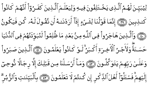 [Nahl 16:36] And indeed We sent to every nation a Noble Messenger (proclaiming) that "Worship Allah and beware of the devil"; therefore Allah guided some of them, and error proved true upon some of them; therefore travel in the land and see what sort of fate befell the deniers! [Nahl 16:37] If you (O dear Prophet Mohammed - peace and blessings be upon him) desire for their guidance, then indeed Allah does not guide one whom He misleads, and they do not have any aides. [Nahl 16:38] And they swore by Allah most vehemently in their oaths that, "Allah will not raise up the dead"; yes He will, why not? A true promise obligatory upon Him, but most men do not know. [Nahl 16:39] In order that He may make clear to them the matter in which they differed, and the disbelievers may realise that they were liars. [Nahl 16:40] And Our command for anything to occur, when We will it, is that We only say to it, "Be" - and it thereupon happens. Section 6 [Nahl 16:41] And to those who migrated in Allah's cause after being oppressed, We shall indeed give them a good place in the world, and indeed the reward of the Hereafter is extremely great; if only the people knew! [Nahl 16:42] Those who patiently endured and who rely only upon Allah. [Nahl 16:43] And We did not send before you except men, towards whom We sent divine revelations - so O people, ask the people of knowledge if you do not know. (* All the Prophets were men.) [Nahl 16:44] Along with clear proofs and writings; and We have sent down this Remembrance towards you (O dear Prophet Mohammed - peace and blessings be upon him) so that you may explain to mankind what has been revealed towards them, and that they may ponder. [Nahl 16:45] So do they who conspire evils, not fear that Allah may bury them in the earth, or that the punishment may come to them from a place they do not know? [Nahl 16:46] Or that He may seize them while they move here and there, for they cannot escape? [Nahl 16:47] Or that He may seize them whilst constantly ruining them? For indeed your Lord is Most Compassionate, Most Merciful. [Nahl 16:48] And have they not observed that the shadows of the things Allah has created incline to the right and to the left, in prostration to Allah, and that they are servile? [Nahl 16:49] And to Allah only prostrates whatsoever is in the heavens and whatsoever moves in the earth, and the angels - and they are not proud. [Nahl 16:50] They bear upon themselves the fear of their