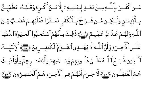 Section 7 [Nahl 16:51] And Allah has proclaimed, "Do not ascribe two Gods; indeed He is the only One God; therefore fear Me alone." [Nahl 16:52] And to Him only belongs all whatever is in the heavens and in the earth, and obeying Him only is obligatory; so will you fear anyone other than Allah? [Nahl 16:53] And whatever blessings you have, are all from Allah - then whenever misfortune reaches you, towards Him only do you seek refuge. [Nahl 16:54] And then, when He averts the misfortune from you, a group among you starts ascribing partners to their Lord! [Nahl 16:55] In order to deny the favours We have given them; so enjoy a little; for you will soon come to know. [Nahl 16:56] And for things unknown, they assign a portion of the sustenance We have given them; by Allah - you will certainly be questioned regarding all that you used to fabricate. [Nahl 16:57] And they assign daughters to Allah - Purity is to Him! - and assign for themselves what they wish. [Nahl 16:58] And when one among of them receives the glad tidings of a daughter, his face turns black for the day, and he remains seething. [Nahl 16:59] Hiding from the people because of the evil of the tidings; "Will he keep her with disgrace, or bury her beneath the earth?"; pay heed! Very evil is the judgement they impose! [Nahl 16:60] Those who do not believe in the Hereafter, for them only is the evil state; and the Majesty of Allah is Supreme; and He only is the Most Honourable, the Wise. Section 8 [Nahl 16:61] Were Allah to seize people on account of their injustices, He would not have left anyone walking on the earth, but He gives them respite up to an appointed promise; then when their promise comes they cannot go back one moment nor come forward. [Nahl 16:62] And they assign to Allah that which is abhorred by themselves, and their tongues speak the lies that goodness is for them; so it occurred that for them is the fire, and they have crossed the limits. [Nahl 16:63] By Allah, We indeed sent Noble Messengers to several nations before you, but Satan made their misdeeds appear good to them - so he only is their companion this day, and for them is a punishment, most painful. [Nahl 16:64] And We did not send down this Book towards you except for you to clearly explain to them the matters in which they may differ, and a guidance and a mercy for the believers. [Nahl 16:65] And Allah sent down water from the sky and with it revived the earth after its death; indeed in this is a sign for people who keep ears *. (* That listen to the truth.) Section 9 [Nahl 16:66] And indeed in cattle is a lesson for you; We provide you drink from what is in their bellies - pure milk from between the excretion and the blood, palatable for the drinkers. [Nahl 16:67] And from the fruits of date and grapes, for you make juices and good nourishment from them; indeed in this is a sign for people of intellect. [Nahl 16:68] And your Lord inspired the bee that, "Build homes in hills, and in trees, and in rooftops." [Nahl 16:69] "Then eat from all kinds of fruits, and tread the ways of your Lord which are soft and easy for you"; from their bellies comes a drink of various colours, in which is health for mankind; indeed in this is a sign for people who ponder. [Nahl 16:70] And Allah created you, and will then remove your souls; and among you is one who is sent back to the most lowly age, so knowing nothing after having had knowledge; indeed Allah knows everything, is Able to do all things. Section 10 [Nahl 16:71] And Allah has made some among you superior above others in livelihood; so those to whom the superiority is given, will not return their livelihood to their slaves, so they may all become equal in this respect; so do they deny the favours of Allah? [Nahl 16:72] And Allah has created for you wives of your own breed, and has given you from your wives, sons and grandsons, and has provided sustenance for you from good things; so do they believe in falsehood and deny the favours of Allah? [Nahl 16:73] And they worship such besides Allah, who do not have power to provide them any sustenance from the heavens or the earth, nor can they do anything. [Nahl 16:74] Therefore do not ascribe equals to Allah; indeed Allah knows whereas you do not know. [Nahl 16:75] Allah has illustrated an example - there is a slave, himself the property of another, not owning anything - and another one upon whom We have bestowed a good livelihood from Us, he therefore spends from it, secretly and publicly; will they be equal? All praise is to Allah; in fact, most of them do not know. [Nahl 16:76] And Allah has illustrated an example - two men - one of them dumb, unable to do anything, and he is a burden on his master - wherever his master sends him, he brings back no good; will he be equal to one who gives the command of justice and is on the Straight Path? Section 11 [Nahl 16:77] And for Allah only are the hidden things of the heavens and the earth, and the matter of Resurrection is not but like the batting of an eyelid - in fact closer than this; indeed Allah is Able to do all things. [Nahl 16:78] And Allah brought you forth from your mothers’ wombs, whilst you did not know anything * - and gave you ears and eyes and hearts, for you to be grateful. (* Prophet Mohammed and Prophet Jesus, among others, are exceptions to this rule - peace and blessings be upon them.) [Nahl 16:79] Have they not seen the birds, subservient in the open skies? No one holds them up except Allah; indeed in this are signs for the people who believe. [Nahl 16:80] And Allah has given you houses for staying, and made some houses from the hides of animals, which are easy for you on your day of travel and on the day of stopover - and from their wool, and fur, and hair, some household items and utilities for a while. [Nahl 16:81] And Allah has provided you shade with the things He has created, and created for you refuge in the hills, and created some clothing for you to protect you from the heat, and some clothing 