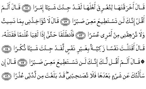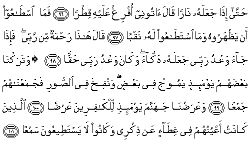 [Kahf 18:1] All praise is to Allah Who sent down the Book upon His bondman, and did not keep any deviation in it. [Kahf 18:2] A just Book, to warn of Allah’s severe punishment, and to give glad tidings to the believers who do good deeds, that for them is an excellent reward. [Kahf 18:3] In which they will abide forever. [Kahf 18:4] And to warn those who say that "Allah has chosen a child." [Kahf 18:5] They do not have any knowledge of it - nor did their forefathers; profound is the word that comes out of their mouths; they only speak a lie. [Kahf 18:6] Possibly you may risk your life by grieving (O dear Prophet Mohammed - peace and blessings be upon him) after them if they do not believe in this narration. [Kahf 18:7] We have indeed placed all that is on the earth as its adornment in order that We may test them, who among them has the best deeds. [Kahf 18:8] And indeed We shall one day make all that is on it a barren plain. [Kahf 18:9] Did you know that the People of the Cave and People close to the Woods, were Our exceptional signs? [Kahf 18:10] When the young men took refuge in the Cave, then said, "Our Lord! Give us mercy from Yourself, and arrange guidance for us in our affair." [Kahf 18:11] We then thumped upon their ears in the Cave for a number of years. (* Put them to sleep.) [Kahf 18:12] We then awakened them to see which of the two groups more accurately tells the period they had stayed. Section 2 [Kahf 18:13] We shall narrate their account to you accurately; they were young men who believed in their Lord, and We increased the guidance for them. [Kahf 18:14] And We made their hearts steadfast when they stood up and said, "Our Lord is the Lord of the heavens and the earth - we shall not worship any other deity except Him - if it were, we have then said something excessive." [Kahf 18:15] "These - the people of ours - have set up Gods besides Allah; why do they not bring a clear proof regarding them? And who is more unjust than one who fabricates a lie against Allah?" [Kahf 18:16] "And when you have disassociated yourself from them and all what they worship besides Allah - so take refuge in the Cave - your Lord will spread His mercy for you and arrange ease for you in your affairs." [Kahf 18:17] And O dear Prophet (Mohammed - peace and blessings be upon him) you will see the sun that when it rises it shifts away to the right of their cave, and when it sets it shifts away to their left, and they are in the open ground of that cave; this is from among the signs of Allah; whomever Allah guides - only he is therefore guided; and whomever He sends astray - you will never find for him a friend who guides. Section 3 [Kahf 18:18] And you may think they are awake, whereas they are asleep; and We turn them over to the right and the left - and their dog is on the threshold of the cave, with its paws outstretched; O listener, were you to look at them closely, you would turn back running away from them, and be filled with their dread. [Kahf 18:19] And similarly We awakened them so that they may enquire about each other; a speaker among them said, "How long have you stayed here?" Some among them said, "We have stayed a day or part of a day"; the others said, "Your Lord well knows how long you have stayed; therefore send one of you to the city with this silver coin - he may then check which food available there is purer, in order to bring some of it for you to eat - and he must be courteous and not inform anyone about you." [Kahf 18:20] "Indeed if they come to know about you, they will stone you or turn you back to their religion - and if so, you will never prosper." [Kahf 18:21] And this is how We made them known for people to know that the promise of Allah is true and that there is no doubt concerning the Last Day; when the people began disputing among themselves regarding them, they said, "Construct a building over their cave"; their Lord well knows them; those who dominated in this matter said, "We promise we will build a mosque over them." [Kahf 18:22] So the people will now say, "They are three, their dog is the fourth"; and some will say, "They are five, their dog is the sixth" - just blind guesses; and some will say, "They are seven, and their dog is the eighth"; proclaim (O dear Prophet Mohammed - peace and blessings be upon him), "My Lord well knows their number - no one knows them except a few"; therefore do not debate concerning them except what has occurred, and do not ask any of the People of the Book(s) anything concerning them. Section 4 [Kahf 18:23] And never say about anything that, "I will do this tomorrow." [Kahf 18:24] Except "If Allah wills"; and remember your Lord when you forget, and say, "It is likely that my Lord will guide me to a more accurate way of virtue than this." [Kahf 18:25] And they stayed in their Cave for three hundred years * and nine more *. (* 300 according to the Solar calendar and 309 according to the Lunar calendar.) [Kahf 18:26] Say, "Allah well knows how long they stayed; for Him only are the hidden of the heavens and the earth; how well He sees and hears! They do not have any supporter besides Him; and He does not associate anyone in His command." [Kahf 18:27] And recite the Book of your Lord which has been divinely revealed to you; there is none who can change His Words; and you will never find a refuge besides Him. [Kahf 18:28] And restrain yourself along with those who pray to their Lord morning and evening, seeking His pleasure; and may not your sight fall on anything besides them; would you desire the adornment of the life of this world? And do not follow him whose heart We have made neglectful of Our remembrance – the one who has followed his own desires and his matter has crossed the limits. [Kahf 18:29] And proclaim that, "The Truth is from your Lord"; so whoever wills may accept faith, and whoever wills may disbelieve - We have indeed prepared for the disbelievers a fire the walls of which will surround them; if they plead for water, th