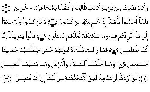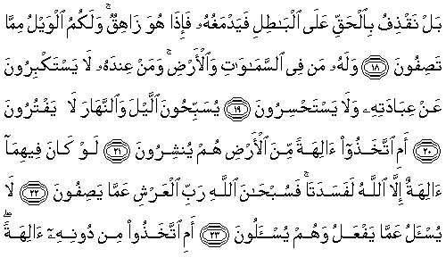 [Ambiya 21:1] The people’s reckoning is near, whereas they are in neglect, turned away! [Ambiya 21:2] Whenever a new advice comes to them from their Lord, they do not listen to it except while playing. [Ambiya 21:3] Their hearts are involved in play; and the unjust secretly conferred, "What is he, except another a human like you?! So do you follow magic although you have perceived?" [Ambiya 21:4] And the Prophet said, "My Lord knows all that is spoken in the heavens and in the earth; and He only is the All Hearing, the All Knowing." [Ambiya 21:5] Rather they said, "These are confused dreams, but in fact he has fabricated it - but in fact he is a poet; so he must bring us some sign, like those who were sent before." [Ambiya 21:6] There is not a township before them which did not believe which We have not destroyed; so will they believe? [Ambiya 21:7] And We did not send (Prophets) before you except men, to whom We sent divine revelations - therefore, O people, ask the people of knowledge if you do not know. [Ambiya 21:8] And We did not create them without bodies so they would not eat food - nor that they abide on earth forever. [Ambiya 21:9] We then fulfilled the promise to them, therefore rescued them and whomever We willed, and destroyed the transgressors. [Ambiya 21:10] We have indeed sent down towards you a Book, in which is your repute; so do you not have sense? Section 2 [Ambiya 21:11] And many a township did We destroy, for they were unjust, and We created other nations after them. [Ambiya 21:12] And when they tasted Our punishment, they immediately started fleeing from it. [Ambiya 21:13] The angels said to them, "Do not flee and return to the comforts that were given to you and to your homes, perhaps you will be questioned." [Ambiya 21:14] They cried, "Woe to us, we were indeed unjust!" [Ambiya 21:15] So they kept saying this until We made them cut off, extinguished. [Ambiya 21:16] And We have not created the heavens and the earth and all that is between them, unnecessarily. [Ambiya 21:17] If We willed to choose a pastime, We could have chosen it from Ourselves - if We wanted to. [Ambiya 21:18] But in fact We hurl the truth upon falsehood, so it scatters its brains - thereupon it vanishes; and for you is the ruination due to the matters you fabricate. [Ambiya 21:19] And to Him only belong all those who are in the heavens and in the earth; and those with Him are not conceited towards worshipping Him, nor do they tire. [Ambiya 21:20] They say His Purity night and day, and do not slacken. [Ambiya 21:21] Have they appointed from the earth, Gods that create something? [Ambiya 21:22] If other than Allah, there were Gods * in the heavens and the earth, they would be destroyed; therefore Purity is to Allah, Owner of the Throne, from the matters that they fabricate. (* Which is not possible. ** The heavens and the earth.) [Ambiya 21:23] He is not questioned whatever He does, whereas they will all be questioned. [Ambiya 21:24] Or have they set up other Gods besides Allah? Say, "Bring your proof; this is the remembrance of those with me and those before me"; but in fact most of them do not know the Truth, so they turn away. [Ambiya 21:25] And We did not send any Noble Messenger before you, but We divinely revealed to him that, "There is no God except I (Allah), therefore worship Me alone." [Ambiya 21:26] And they said, "The Most Gracious has chosen a son - Purity is to Him; but in fact they are honourable bondmen." [Ambiya 21:27] They do not speak before He has, and they act only at His command. [Ambiya 21:28] He knows what is before them and what is behind them, and they do not intercede except for him whom He likes, and they fear with awe of Him. (The Holy Prophets and virtuous people will be given the permission to intercede. Prophet Mohammed - peace and blessings be upon him - will be the first to intercede.) [Ambiya 21:29] And the one among them who says, "I am a God beside Allah" - We shall reward him with hell; this is how We punish the unjust. Section 3 [Ambiya 21:30] Did not the disbelievers observe that the heavens and the earth were together, so We parted them, and we made every living thing from water? So will they not accept faith? [Ambiya 21:31] And We have placed mountains as anchors in the earth so that it may not shake with them; and We kept wide roads in it, so that they may find guidance. [Ambiya 21:32] And We have made the sky a roof, protected; and they turn away from its signs. [Ambiya 21:33] And it is He Who created the night and the day, and the sun and the moon; each one floats in an orbit. [Ambiya 21:34] And before you, We did not appoint on earth a never-ending life for any human; will they, if you depart, become immortal? [Ambiya 21:35] Every living being must taste death; and We test you with harm and with good, a trial; and to Us only you have to return. [Ambiya 21:36] And when the disbelievers see you, they do not appoint you except as an object of mockery; "Is he the one who speaks ill of your Gods?"; whereas they deny the remembrance of the Most Gracious Himself! [Ambiya 21:37] Man has been created hasty; very soon I shall show you My signs, do not be impatient. [Ambiya 21:38] And they say, "When will this promise occur, if you are truthful? [Ambiya 21:39] If only the disbelievers realised the time when they will not be able to stop the fire from their faces and from their backs - and nor are they to be helped. [Ambiya 21:40] In fact it will suddenly come upon them, therefore shocking them, and they will not be able to repel it nor will they be given respite. [Ambiya 21:41] And indeed the Noble Messengers before you were mocked at, but their mockery ruined the mockers themselves. Section 4 [Ambiya 21:42] Proclaim, "Who guards you night and day from the Most Gracious?" In fact they have turned away from the remembrance of their Lord. [Ambiya 21:43] Do they have some Gods who protect them from Us? Neither can they save themselves nor save their friends from U