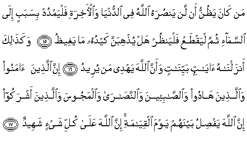 [Hajj 22:01] O people, fear your Lord; indeed the earthquake of the Last Day is a tremendous thing. [Hajj 22:02] On the day when you will witness it, every nursing mother will forget her nurseling and every pregnant one will discharge her burden, and you (O dear Prophet Mohammed - peace and blessings be upon him) will see people as if they are drunk, whereas they will not be intoxicated, but the fact is that Allah’s punishment is very severe. [Hajj 22:03] And among people are some who argue concerning Allah without knowing, and blindly follow every rebellious devil. [Hajj 22:04] (The devil) Upon whom is decreed that whoever befriends him, he will certainly mislead him and show him the path to hell. [Hajj 22:05] O people, if you doubt your revival on the Day of Resurrection, then ponder that We created you from dust, then from a drop of liquid, then from a clot, then from a piece of flesh formed and without form, so that We show you Our signs for you; and We keep whomever We want inside the mothers’ wombs up to an appointed time, then extract you as infants, then in order that you reach your puberty; and among you is one who dies earlier, and among you is one put to the most abject age, so after having knowledge, knows nothing; and you see the earth desolate, then when We sent down water upon it, it freshened up and developed and produced beautiful pairs of all kinds. [Hajj 22:06] This is because Allah only is True and because He will revive the dead, and because He is Able to do all things. [Hajj 22:07] And because the Last Day will come, there is no doubt in it - and because Allah will revive those who are in the graves. [Hajj 22:08] And there is one who argues concerning Allah without having knowledge nor any proof nor a clear text. [Hajj 22:09] With his neck turned away from the truth, in order to deceive from the way of Allah; for him is disgrace in this world and on the Day of Resurrection We shall make him taste the punishment of fire. [Hajj 22:10] "This is the recompense of what your hands have sent ahead, and Allah does not oppress His bondmen." Section 2 [Hajj 22:11] And there are some men who worship Allah upon an edge; then if some good occurs to them, they are content; and if some trial comes, they turn way upon their faces; a loss of this world and the Hereafter; and this is the complete loss. [Hajj 22:12] They worship such, beside Allah, which neither harms them nor benefits them; this only is the extreme error. [Hajj 22:13] They worship one from whom harm is expected more than the benefit; indeed what an evil master and indeed what an evil friend! [Hajj 22:14] Indeed Allah will admit those who believed and did good deeds, into Gardens beneath which rivers flow; indeed Allah does whatever He wills. [Hajj 22:15] Therefore whoever assumes that Allah will not assist His Prophet (Mohammed - peace and blessings be upon him) in this world and the Hereafter, should extend a rope upwards and hang himself, and then see whether his scheme has taken away what he envies. [Hajj 22:16] And so it is, that We sent down this Qur’an - clear verses - and that Allah guides whomever He wills. [Hajj 22:17] Indeed the Muslims, and the Jews, and the Sabeans, and the Christians and the fire worshippers and the polytheists - indeed Allah will decide between all of them on the Day of Resurrection; indeed Allah witnesses all things. [Hajj 22:18] Did you not see that for Allah prostrate those who are in the heavens and in the earth, and the sun, and the moon, and the stars, and the hills, and the trees, and the beasts, and many among mankind; and there are many upon whom the punishment has been decreed; and he whom Allah disgraces - there is none to give him honour; indeed Allah may do whatever He wills. (Command of Prostration # 6) [Hajj 22:19] These are the two groups who fought concerning their Lord; so those who disbelieved – garments of fire have been fashioned for them; and boiling water will be poured onto their heads. [Hajj 22:20] With which will melt what is in their bellies, and their skins. [Hajj 22:21] And for them are rods of iron. [Hajj 22:22] Whenever they wish to come out of it due to suffocation, they will be returned to it again and it will be commanded, "Taste the punishment of fire!" Section 3 [Hajj 22:23] Indeed Allah will admit those who believed and did good deeds into Gardens beneath which rivers flow, in it they will be made to wear armlets of gold, and pearls, and in it their garment is silk. [Hajj 22:24] And they were guided to sacred speech; and they were shown the path of the Most Praiseworthy. [Hajj 22:25] Indeed those who have disbelieved and prevent from the way of Allah and from this Sacred Mosque, which We have appointed for all mankind – its resident and the foreigner have the same rights in it; and whoever wrongfully intends injustice in it - We shall make him taste a painful punishment. Section 4 [Hajj 22:26] And remember when We showed Ibrahim the right place of the Sacred House (mosque) and commanded that, "Do not ascribe anything as a partner to Me, and keep My House clean for those who encircle it and those who stay in it (for worship) and those who bow and prostrate." [Hajj 22:27] "And publicly announce the pilgrimage to all people – they will come to you, on foot and on every lean she-camel, coming from every far distant journey." (The announcement by Prophet Ibrahim reached each and every soul.) [Hajj 22:28] In order that they may gain their benefit, and mention the name of Allah on the appointed days as He has bestowed the sustenance to them – the inarticulate animals; therefore eat from them yourself and feed the distressed destitute. [Hajj 22:29] They must then remove their dirt and fulfil their pledges and go around the Free House. [Hajj 22:30] So it is; and whoever reveres the sacred things of Allah – that is then a goodness for him in the sight of his Lord; the inarticulate animals are lawful to you except those the forbidding of which i