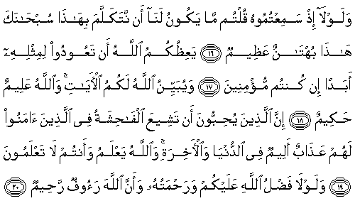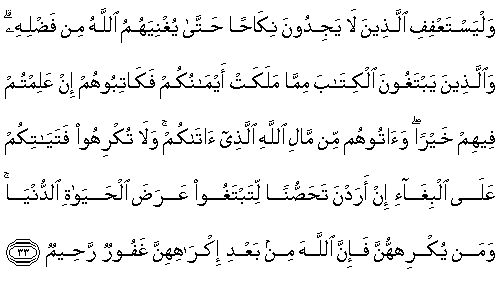 [Noor 24:1] This is a surah which We have sent down and decreed its commands, and in which We have sent down clear verses, in order that you may ponder. [Noor 24:2] The adulteress and the adulterer - punish each one of them with a hundred lashes; and may you not have pity on them in the religion to Allah, if you believe in Allah and the Last Day; and a group of believers must witness their punishment. [Noor 24:3] The adulterer shall not marry except an adulteress or a polytheist woman, and none shall marry an adulteress except an adulterer or a polytheist; and this is forbidden for the believers. [Noor 24:4] And those who accuse chaste women and do not bring four witnesses to testify - punish them with eighty lashes and do not ever accept their testimony; and it is they who are the wicked. [Noor 24:5] Except those who repent after this and reform themselves; so indeed Allah is Oft Forgiving, Most Merciful. [Noor 24:6] And those who accuse their wives and do not have witnesses except their own statements – for such the testimony is that he bear the testimony four times by the name of Allah that he is truthful. [Noor 24:7] And the fifth time, that the curse of Allah be upon him if he is a liar. [Noor 24:8] And the punishment shall be averted from the woman if she bears the testimony four times by the name of Allah, that the man is a liar. [Noor 24:9] And the fifth time, that the wrath of Allah be upon her if the man is truthful. [Noor 24:10] And were it not for Allah’s munificence and His mercy upon you and that Allah is the Acceptor of Repentance, the Wise – He would then have unveiled you. Section 2 [Noor 24:11] Indeed those who have brought this great accusation are a group from among you; do not consider it bad for you; on the contrary, it is good for you; for each man among them is the sin that he has earned; and for the one among them who played the greatest part in it – for him is a terrible punishment. [Noor 24:12] Why was it not that the believing men and women, when you heard it, thought good of their own people, and had said, "This is a clear accusation"? [Noor 24:13] Why did they not bring four witnesses upon it? Since they did not bring witnesses, they themselves are liars before Allah. [Noor 24:14] And were it not for Allah’s munificence and His mercy upon you in the world and in the Hereafter, a terrible punishment would have reached you for the discussions you fell into. [Noor 24:15] When you rumoured with your tongues after hearing such matters, and uttered with your mouths about which you had no knowledge, and you considered it light; and that, in the sight of Allah, is very great. [Noor 24:16] And why was it not that, when you heard it, you would have said, "It does not befit us to speak regarding this; Purity is to You, O Allah – this is a great accusation." [Noor 24:17] Allah advises you never to speak like this again, if you have faith. [Noor 24:18] And Allah clearly explains the verses for you; and Allah is All Knowing, Wise. [Noor 24:19] Indeed those who wish that slander should spread among the Muslims – for them is a painful punishment in this world and in the Hereafter; and Allah knows, and you do not know. [Noor 24:20] And were it not for Allah’s munificence and His mercy upon you, and that Allah is Forgiving, Most Merciful - you would have tasted its outcome. Section 3 [Noor 24:21] O People who Believe! Do not follow the footsteps of the devil; and whoever follows the footsteps of the devil – so he will only bid the indecent and the evil; and were it not for Allah’s munificence and His mercy upon you, none of you would ever become pure – but Allah purifies whomever He wills; and Allah is All Hearing, All Knowing. [Noor 24:22] And may not those who possess superiority (in wealth) among you and possess capacity, swear not to give to the relatives and to the needy, and to immigrants in Allah's cause; and they should forgive and forbear; do you not like that Allah may forgive you? And Allah is Oft Forgiving, Most Merciful. [Noor 24:23] Indeed those who accuse the innocent virtuous, believing women – upon them is a curse in this world and in the Hereafter; and for them is a terrible punishment. [Noor 24:24] On the day when their tongues and their hands and their feet will testify against them, regarding what they used to do. [Noor 24:25] On that day Allah will give them their true punishment, and they will know that Allah only is the Clear Truth. [Noor 24:26] Vile women for vile men, and vile men for vile women; and virtuous women for virtuous men, and virtuous men for virtuous women; such are innocent of what these people say; for them are forgiveness, and an honourable sustenance. Section 4 [Noor 24:27] O People who Believe! Do not enter the houses except your own until you obtain permission and have conveyed peace upon its inhabitants; this is better for you, in order that you may ponder. [Noor 24:28] And if you do not find anyone in them, even then do not enter without the permission of their owners; and if it is said to you, "Go away" then go away – this is much purer for you; and Allah knows your deeds. [Noor 24:29] There is no sin upon you to enter houses not made especially for someone’s habitation, and you have permission for its use; and Allah knows what you disclose and what you hide. [Noor 24:30] Command the Muslim men to keep their gaze low and to protect their private organs; that is much purer for them; indeed Allah is Aware of their deeds. [Noor 24:31] And command the Muslim women to keep their gaze low and to protect their chastity, and not to reveal their adornment except what is apparent, and to keep the cover wrapped over their bosoms; and not to reveal their adornment except to their own husbands or fathers or husbands’ fathers, or their sons or their husbands’ sons, or their brothers or their brothers’ sons or sisters’ sons, or women of their religion, or the bondwomen they possess, or male servants provided 