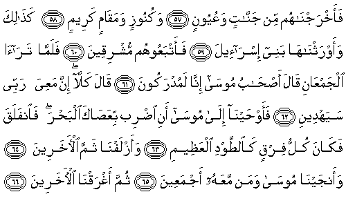 [Shua`ra 26:1] Ta-Seen-Meem. (Alphabets of the Arabic language – Allah, and to whomever he reveals, know their precise meanings.) [Shua`ra 26:2] These are verses of the clear Book. [Shua`ra 26:3] Possibly you may risk your life (O dear Prophet Mohammed - peace and blessings be upon him) by grieving, because they did not believe. [Shua`ra 26:4] If We will, We can send down on them a sign from the sky so that their leaders would remain bowed before it. [Shua`ra 26:5] And never does a new advice come to them from the Most Gracious, but they turn away from it. [Shua`ra 26:6] Indeed they have denied, so now soon coming upon them are the tidings of what they used to scoff at. [Shua`ra 26:7] Have they not seen the earth, that how many honourable pairs We have created in it? [Shua`ra 26:8] Indeed in this is a sign; and most of them will not accept faith. [Shua`ra 26:9] And indeed your Lord – indeed only He is the Almighty, the Most Merciful. Section 2 [Shua`ra 26:10] And (remember) when your Lord said to Moosa, “Go to the unjust people.” [Shua`ra 26:11] “The nation of Firaun; will they not fear?” [Shua`ra 26:12] He said, “My Lord, I fear that they will deny me.” [Shua`ra 26:13] “I feel hesitant, and my tongue does not speak fast, therefore make Haroon also a Noble Messenger.” [Shua`ra 26:14] “And they have an accusation against me, so I fear that they may kill me.” [Shua`ra 26:15] He said, “Not like this (any more); both of you go with Our signs, We are with you, All Hearing.” [Shua`ra 26:16] “Therefore approach Firaun then proclaim, ‘We both are Noble Messengers of the Lord Of The Creation.’ [Shua`ra 26:17] ‘That you let the Descendants of Israel go with us.’ ” [Shua`ra 26:18] Said Firaun, “Did we do not raise you amongst us, as a child? And you spent many years of your life among us!” [Shua`ra 26:19] “And you committed the deed of yours that you committed, and you were ungrateful.” [Shua`ra 26:20] Said Moosa, “I did that at a time when I was unaware of the consequences.” (In anger - See verse 28:15) [Shua`ra 26:21] “I therefore went away from you as I feared you – so my Lord commanded me and appointed me as one of the Noble Messengers.” [Shua`ra 26:22] “And is this some great reward for which you express favour upon me – that you have enslaved the Descendants of Israel?” [Shua`ra 26:23] Said Firaun, “And what is the Lord Of The Creation? [Shua`ra 26:24] Said Moosa, “Lord of the heavens and the earth and all that is between them; if you believe.” [Shua`ra 26:25] Said Firaun to those around him, “Are you not listening with attention?” [Shua`ra 26:26] Said Moosa, “Your Lord and the Lord of your forefathers preceding you.” [Shua`ra 26:27] Said Firaun, “This (Noble) Messenger of yours, who has been sent towards you, has no intelligence!” [Shua`ra 26:28] He said, “The Lord of the East and the West and all that is between them; if you have sense.” [Shua`ra 26:29] Said Firaun, “If you ascribe any one else as a God other than me, I will surely imprison you.” [Shua`ra 26:30] Said Moosa, “Even if I bring to you something clear?” [Shua`ra 26:31] Said Firaun, “Then bring it, if you are of the truthful.” [Shua`ra 26:32] So Moosa put down his staff and it became a visible serpent. [Shua`ra 26:33] And he drew forth his hand, thereupon it shone bright before the beholders. Section 3 [Shua`ra 26:34] Said Firaun to the court members around him, “He is indeed an expert magician.” [Shua`ra 26:35] “He wishes to expel you out of your land by his magic; so what is your advice?” [Shua`ra 26:36] They said, “Stop him and his brother, and send gatherers to the cities.” [Shua`ra 26:37] “To bring to you every expert great magician.” [Shua`ra 26:38] So the magicians were gathered at a set time on a day appointed. [Shua`ra 26:39] And it was said to the people, “Have you (also) gathered?” [Shua`ra 26:40] The people said, “Perhaps we may follow the magicians if they are victorious.” [Shua`ra 26:41] So when the magicians came, they said to Firaun, “Will we get some reward if we are victorious?” [Shua`ra 26:42] He said, “Yes, and you will then become close to me.” [Shua`ra 26:43] Moosa said to them, “Throw what you want to.” [Shua`ra 26:44] So they threw down their ropes and their staves and exclaimed, “By the honour of Firaun, indeed victory is ours!” [Shua`ra 26:45] Therefore Moosa put forth his staff – so it immediately began swallowing all their fabrications. [Shua`ra 26:46] The magicians therefore fell down prostrate. [Shua`ra 26:47] They said, “We have accepted faith in the Lord Of The Creation.” [Shua`ra 26:48] “The Lord of Moosa and Haroon.” [Shua`ra 26:49] Said Firaun, “You accepted faith in him before I permitted you! He is indeed your leader who taught you magic; so now you will come to know; I swear, I will certainly cut off your hands and your feet from alternate sides, and crucify all of you.” [Shua`ra 26:50] They said, “No harm (in it), we will return to our Lord.” [Shua`ra 26:51] “We hope that our Lord will forgive us our mistakes, as we are the first to believe.” Section 4 [Shua`ra 26:52] And We sent the divine revelation to Moosa that, “Journey along with My bondmen within the night, for you will be pursued.” [Shua`ra 26:53] So Firaun sent gatherers into the cities. [Shua`ra 26:54] They announced “These people are a small group.” [Shua`ra 26:55] “And indeed they have angered all of us.” [Shua`ra 26:56] “And indeed we are an alert army.” [Shua`ra 26:57] We therefore got them out from the gardens and water springs. [Shua`ra 26:58] And from treasures and nice houses. [Shua`ra 26:59] So it was; and We made the Descendants of Israel its inheritors. [Shua`ra 26:60] So the Firaun’s people followed them at sunrise. [Shua`ra 26:61] And when the two groups saw each other, those with Moosa said, “They have caught us.” [Shua`ra 26:62] Said Moos
