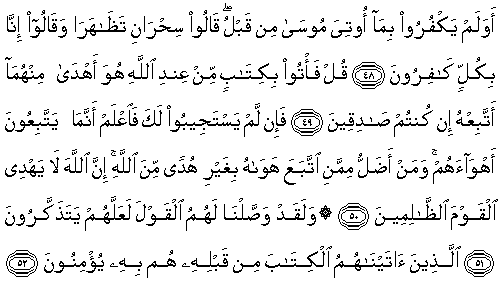 [Qasas 28:1] Ta-Seen-Meem. (Alphabets of the Arabic language - Allah and to whomever he reveals, know their precise meanings.) [Qasas 28:2] These are verses of the clear Book. [Qasas 28:3] We shall narrate to you the true tidings of Moosa and Firaun, for the people who have faith. [Qasas 28:4] Indeed Firaun had achieved dominance in the earth and made its people subservient to him – seeing a group among them weak, he used to kill their sons and spare their women; he was indeed very mischievous. [Qasas 28:5] And We willed to favour those who were weak in the earth, and to make them leaders and to make them the inheritors (of the land and wealth of Firaun’s people). [Qasas 28:6] And to give them control in the land, and to show Firaun and Haman and their armies what they fear from them. [Qasas 28:7] And We inspired the mother of Moosa that, “Suckle him; then when you fear for him, cast him into the river and do not fear nor grieve; We shall indeed return him back to you and make him one of the Noble Messengers.” [Qasas 28:8] So the family of Firaun picked him up, in order that he become their enemy and a sorrow upon them; indeed Firaun and Haman and their armies were guilty. [Qasas 28:9] And Firaun’s wife said, “This child is the comfort of my eyes and yours *; do not kill him; perhaps he may benefit us, or we may adopt him as our son” - and they were unaware. (Had Firaun also said the same, Allah would have granted him faith.) [Qasas 28:10] And in the morning, the heart of Moosa’s mother became impatient; and she would have almost certainly given away his secret had We not strengthened her heart, so that she may have faith in Our promise. [Qasas 28:11] And she said to his sister, “Go after him” - she therefore observed him from far, and they were not aware. [Qasas 28:12] And We had already forbidden suckle-nurses for him, so she said, “Shall I show you a household that will nurse this child of yours, and they are his well-wishers?” [Qasas 28:13] So We returned him to his mother in order to soothe her eyes and not grieve, and to know that Allah’s promise is true – but most people do not know. Section 2 [Qasas 28:14] And when he reached his maturity and full strength, We gave him wisdom and knowledge; and this is how We reward the virtuous. [Qasas 28:15] And he entered the city when its inhabitants were sleeping unaware in the afternoon - he therefore found two men fighting; one was from Moosa’s group, and the other from among his enemies; so the one who was of Moosa’s group pleaded to Moosa for help against him who was of his enemies - therefore Moosa punched him thereby finishing him; he said, “This act was from the devil *; indeed he is an open enemy, a misleader.” (* The act of oppressing the man from Bani Israel). [Qasas 28:16] He said, “My Lord! I have indeed wronged my soul * therefore forgive me” – He therefore forgave him; indeed only He is the Oft Forgiving, the Most Merciful. (* By getting angry.) [Qasas 28:17] He said, “My Lord! The way You have bestowed favour upon me, so never will I be a supporter of the guilty.” [Qasas 28:18] So he was in the city at morning fearing, waiting to see what happens – thereupon he sighted the one who had appealed to him the day before, crying out to him for help; Moosa said to him, “Indeed you are clearly astray.” [Qasas 28:19] So when Moosa wished to apprehend the man who was an enemy to them both, he said, “O Moosa! Do you wish to kill me the way you killed a man yesterday? You only wish to become a strict ruler in the land, and not to make reform.” [Qasas 28:20] And a man came running from the outer part of the city; he said, “O Moosa! Indeed the court members are considering killing you, therefore go away - I surely am your well-wisher.” [Qasas 28:21] So he left the city in fear, waiting to see what happens; he said, “My Lord! Rescue me from the unjust people.” Section 3 [Qasas 28:22] And when he turned his attention towards Madyan he said, “It is likely that my Lord will show me the right path.” [Qasas 28:23] And when he came to the water of Madyan he found a group of men, watering their animals; and away from them he found two women restraining their animals; he said, “What is the matter with you?” They said, “We do not water our animals till all the shepherds water and take away their animals; and our father is very old.” [Qasas 28:24] Therefore Moosa watered their animals for them, and then turned towards the shade and said, “My Lord! I am in need of the sustenance you may send down for me.” [Qasas 28:25] So one of the two women approached him, walking shyly; she said, “My father is calling you, in order to give you wages because you watered our animals for us”; when Moosa came to him and had told him the story, he said, “Do not fear, you are safe from the unjust people.” [Qasas 28:26] One of the two women said, “O my father! Employ him – indeed a strong and trustworthy employee is better.” [Qasas 28:27] He said, “I wish to give you one of these two daughters of mine in marriage, the bridal money being that you work for me for eight years; then if you complete ten years, it will be from you; and I do not wish to put you in hardship; Allah willing, you will probably find me of the righteous.” [Qasas 28:28] Said Moosa, “This is agreed between me and you; there shall be no claim upon me if I fulfil any of these two terms; and Allah is the Trustee upon this word of ours.” Section 4 [Qasas 28:29] So when Moosa completed his term and was travelling with his wife, he saw a fire in the direction of the Mount (Sinai); he said to his wife “Stay here - I have sighted a fire in the direction of the mount – perhaps I may bring you some news from it, or an ember so that you may warm yourselves.” [Qasas 28:30] And when he reached the fire, he was called out to from the right side of the valley in the blessed field, from the tree, “O Moosa! Indee