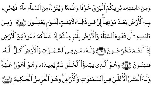 [Ruum 30:1] Alif-Laam-Meem. (Alphabets of the Arabic language – Allah, and to whomever He reveals, know their precise meanings.) [Ruum 30:2] The Romans have been defeated. [Ruum 30:3] In the nearby land, and after their defeat they will soon be victorious. [Ruum 30:4] Within a few (up to nine) years time; only for Allah is the command, before and after; and the believers will rejoice on that day. [Ruum 30:5] With the help of Allah; He helps whomever He wills; and only He is the Almighty, the Most Merciful. [Ruum 30:6] The promise of Allah; Allah does not renege on His promise, but most people do not know. [Ruum 30:7] They know only the visible worldly life; and are totally neglectful of the Hereafter. [Ruum 30:8] Have they not inwardly pondered – that Allah has not created the heavens and the earth, and all that is between them, except with truth and a fixed term? And indeed many people deny the meeting with their Lord. [Ruum 30:9] And did they not travel in the land to see what sort of fate befell those before them? They were stronger than them, and they cultivated the land and inhabited it more than them, and their Noble Messengers came to them with clear proofs; so it did not befit Allah’s Majesty to oppress them, but it was they who used to wrong themselves. [Ruum 30:10] Then the fate of those who committed evil to the extreme was that they denied the signs of Allah and used to mock at them. Section 2 [Ruum 30:11] Allah initiates the creation, then will create it again - then it is to Him that you will return. [Ruum 30:12] And on the Last Day– when it is established, the guilty * will lose all hope. (* The disbelievers.) [Ruum 30:13] And the partners they ascribed will not be their intercessors - and they will deny their partners. [Ruum 30:14] And on the Last Day – that day they will all separate. [Ruum 30:15] So those who believed and did good deeds – they will be hosted in the Garden. [Ruum 30:16] And those who disbelieved, and denied Our signs and confronting the Hereafter – they will be hauled into the punishment. [Ruum 30:17] So proclaim the Purity of Allah when you witness the night and the morning. [Ruum 30:18] And only His is the praise in the heavens and the earth - and before the day ends and at noon. [Ruum 30:19] He brings forth the living from the dead, and brings forth the dead from the living, and He revives the earth after its death; and this how you will be raised. Section 3 [Ruum 30:20] And among His signs is that He created you from dust, and therefore you are human beings spread in the earth. [Ruum 30:21] And among His signs is that He created spouses for you from yourselves for you gain rest from them, and kept love and mercy between yourselves; indeed in this are signs for the people who ponder. [Ruum 30:22] And among His signs is the creation of the heavens and the earth, and the differences in your languages and colours; indeed in this are signs for people who know. [Ruum 30:23] And among His signs is your sleeping during the night and day, and your seeking His munificence; indeed in this are signs for people who heed. [Ruum 30:24] And among His signs is that He shows you the lightning, instilling fear and hope, and sends down water from the sky, so revives the earth after its death; indeed in this are signs for people of intellect. [Ruum 30:25] And among His signs is that the heavens and the earth remain established by His command; then when He calls you - from the earth – you will thereupon emerge. [Ruum 30:26] And to Him only belong all those who are in the heavens and the earth; all are submissive to Him. [Ruum 30:27] And it is He Who initiates the creation, and will then create it again - and this, according to you, should be easier for Him! And for Him only is the Supreme Majesty in the heavens and the earth; and only He is the Almighty, the Wise. Section 4 [Ruum 30:28] He illustrates an example for you from your own selves; do you have for yourselves, among the bondmen you possess, partners in the sustenance We have bestowed upon you, thereby you become equal in respect of it - you fearing them the way you fear each other? This is how We illustrate detailed signs for the people of intellect. [Ruum 30:29] Rather the unjust followed their own desires, without knowledge; so who can guide one whom Allah has sent astray? And they do not have supporters. [Ruum 30:30] Therefore set your attention for obeying Allah, devoted solely to Him; the foundation set by Allah, upon which He created man; do not change what Allah has created; this is the proper religion - but most people do not know. [Ruum 30:31] Inclining towards Him - and fear Him, and keep the prayer established, and never be of the polytheists. [Ruum 30:32] Those who broke their religion into several parts and became different groups; every group is happy with what it has. [Ruum 30:33] And when some affliction reaches men, they pray to their Lord inclining towards Him – and when He gives them a taste of His mercy, thereupon a group among them begins setting up partners to their Lord! [Ruum 30:34] In order to be ungrateful for Our bestowal; “Therefore enjoy”; you will soon come to know. [Ruum 30:35] Or have We sent down to them any proof, which therefore tells them of My partners? [Ruum 30:36] And when We give people the taste of mercy they rejoice at it; and if an ill fortune reaches them because of what their hands have sent ahead - thereupon they lose hope! [Ruum 30:37] And did they not see that Allah eases the sustenance for whomever He wills and restricts it for whomever He wills? Indeed in this are signs for people who believe. [Ruum 30:38] Therefore give the relative his right, and to the needy, and to the traveller; this is better for those who seek the pleasure of Allah; and it is they who are the successful. [Ruum 30:39] And that which you give upon usury, in order that it may increase the creditors’ property, will not increase before Allah; and the charity you give seek