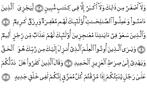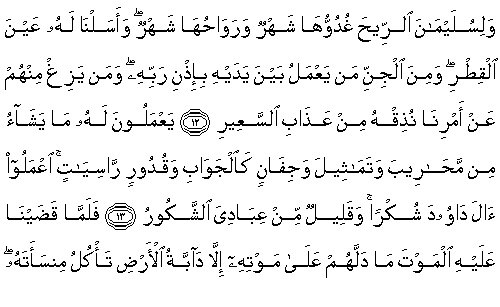 [Saba 34:1] All praise is to Allah – to Him only belongs all whatever is in the heavens and all whatever is in the earth – and His is the praise in the Hereafter; and He is the Wise, the All Aware. [Saba 34:2] He knows all that goes into the earth and all that comes out of it, and all that descends from the skies and all that ascends into it; and only He is the Most Merciful, the Oft Forgiving. [Saba 34:3] And the disbelievers said, “The Last Day will never come upon us”; proclaim, “Surely yes, why not? By oath of my Lord, it will surely come upon you - the All Knowing of the hidden; nothing is hidden from Him - equal to an atom or less than it or greater - in the heavens or in the earth, but it is in a clear Book.” [Saba 34:4] So that He may reward those who believed and did good deeds; it is these for whom is forgiveness, and an honourable sustenance. [Saba 34:5] And those who strove in Our signs in order to defeat – for them is a punishment from the severe painful punishments. [Saba 34:6] And those who received the knowledge know that what is sent down upon you from your Lord is the truth, and it shows the path of the Most Honourable, the Most Praiseworthy. [Saba 34:7] And the disbelievers said, “Shall we show you a man who will tell you that ‘When you have disintegrated into the smallest pieces, you are to be created again’?” [Saba 34:8] “Has he fabricated a lie against Allah, or is he insane?” Rather those who disbelieve in the Hereafter are in the punishment and extreme error. [Saba 34:9] So did they not see what is before them and what is behind them in the sky and the earth? If We will, We can bury them into the earth or cause a part of the sky to fall on them; indeed in this is a sign for every repentant bondman. Section 2 [Saba 34:10] And indeed We gave Dawud the utmost excellence from Us; “O the hills and birds, repent towards Allah along with him”; and We made iron soft for him. [Saba 34:11]"Make large coats of armour and keep proper measure while making; and all of you perform good deeds; I am indeed seeing your deeds.” [Saba 34:12] And We gave the wind in Sulaiman’s control – its morning journey equal to a month’s course and the evening journey equal to a month’s course; and We sprung a stream of molten copper for him; and from the jinns, who worked before him by the command of his Lord; and those among them who turned away from Our command - We shall make them taste the punishment of the blazing fire. [Saba 34:13] They made for him whatever he wished - synagogues and statues, basins like ponds, and large pots built into the ground; “Be thankful, O the people of Dawud!” And few among My bondmen are grateful. [Saba 34:14] So when We sent the command of death towards him, no one revealed his death to the jinns except the termite of the earth which ate his staff; and when he came to the ground, the truth about the jinns was exposed - if they had known the hidden, they would not have remained in the disgraceful toil. [Saba 34:15] Indeed for (the tribe of) Saba was a sign in their dwelling-place - two gardens on the right and the left; “Eat the sustenance provided by your Lord and be grateful to Him”; a pure land and an Oft Forgiving Lord! [Saba 34:16] In response they turned away - We therefore sent upon them a tremendous flood, and in exchange of their two gardens gave them two gardens bearing bitter fruit, and tamarisk, and some berries. [Saba 34:17] We gave them this reward – the recompense of their ingratitude; and whom do We punish, except the ungrateful? [Saba 34:18] And We had made several towns upon the road between them and the towns which We had blessed – and kept them according to the length of the journey; “Travel safely in them, by night and by day.” [Saba 34:19] So they said, “Our Lord! Make the stage between our journeys longer” and they wronged themselves – We therefore turned them into fables and scattered them completely with adversity; indeed in this are signs for every greatly enduring, most grateful person. [Saba 34:20] And indeed Iblis made his assumptions regarding them seem true, so they all followed him except the group of Muslims. [Saba 34:21] And Satan had no control over them at all, except that We willed to reveal as to who believes in the Hereafter and who is in doubt of it; and your Lord is a Guardian over all things. Section 3 [Saba 34:22] Proclaim, “Call those whom you assume (as Gods) besides Allah”; they do not own anything equal even to an atom either in the heavens or in the earth, nor do they have any share in them, nor is any one among them an aide to Allah. [Saba 34:23] And intercession does not benefit before Him, except for one whom He permits; to the extent that when the fear is removed from their hearts by giving permission, they say to each other, “How splendidly has your Lord spoken!” They say, “All that He has proclaimed is the Truth; and He is the Supreme, the Great.” [Saba 34:24] Proclaim, “Who provides you sustenance from the sky and the earth?” Proclaim, “Allah - and indeed either we or you are upon guidance, or in open error.” [Saba 34:25] Proclaim, “You will not be questioned regarding the sins you assume we have committed, nor will we be questioned regarding your misdeeds.” [Saba 34:26] Say, “Our Lord will bring us all together, and then judge truthfully between us; and He is the Best Judge, the All Knowing.” [Saba 34:27] Say, “(Dare you) Show me those whom you have matched with Him – never! Rather only He is Allah, the Most Honourable, the Wise.” [Saba 34:28] And O dear Prophet, We have not sent you except with a Prophethood that covers the entire mankind, heralding glad tidings and warnings, but most people do not know. (Prophet Mohammed – peace and blessings be upon him – is the Prophet towards all mankind.) [Saba 34:29] And they say, “When will this promise come, if you are truthful? [Saba 34:30] Proclaim “For you is t
