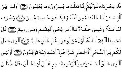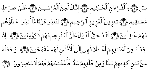 [Yaa-Seen 36:1] Yaa-Seen (Alphabets of Arabic language - Allah and to whomever He reveals, know their precise meanings.) [Yaa-Seen 36:2] By oath of the wise Qur’an. [Yaa-Seen 36:3] You (O dear Prophet Mohammed – peace and blessings be upon him) are indeed one of the Noble Messengers. [Yaa-Seen 36:4] On the Straight Path. [Yaa-Seen 36:5] (The Qur’an is) Sent down by the Almighty, the Most Merciful. [Yaa-Seen 36:6] So that you may warn these people whose ancestors were not warned, they are therefore unaware. [Yaa-Seen 36:7] Undoubtedly, it (their disbelief) has proved true for most of them, so they will not believe. [Yaa-Seen 36:8] We have indeed put shackles around their necks reaching up to the chins, so they remain facing upwards. [Yaa-Seen 36:9] And We have set a wall before them and a wall behind them, and covered the top - so they are unable to see anything. [Yaa-Seen 36:10] And it is the same for them, whether you warn them or do not warn them - they will not believe. [Yaa-Seen 36:11] You warn only him who follows the advice and fears the Most Gracious without seeing; therefore give him glad tidings of forgiveness and an honourable reward. [Yaa-Seen 36:12] We will surely bring the dead to life and We record what they send ahead and the signs they will leave behind; and We have accounted all things in a clear Book. Section 2 [Yaa-Seen 36:13] And relate to them the signs of the people of the city - when two emissaries came to them. [Yaa-Seen 36:14] When We had sent two towards them and they denied them both, so We fortified them with a third, and they all said, “Indeed we have been sent to you.” [Yaa-Seen 36:15] They said, “You are nothing but mortals like us; the Most Gracious has not sent down anything - you are nothing but liars.” [Yaa-Seen 36:16] They answered, “Our Lord knows that surely, without doubt, we have been sent towards you.” [Yaa-Seen 36:17] “And our duty is nothing but to plainly convey (the message).” [Yaa-Seen 36:18] They (the people of the city) said, “We think you are ominous; indeed, if you do not desist, we shall surely stone you to death, and you will surely face a grievous torture at our hands.” [Yaa-Seen 36:19] They said, “Your evil omens are with you! What! You get annoyed for being advised? In fact you are a people who transgress the limits!” [Yaa-Seen 36:20] And from the outermost part of the city came a man running; he said, “O my people! Obey those who have been sent.” [Yaa-Seen 36:21] “Obey those who do not ask any fee from you, and they are on guidance.” PART 23 [Yaa-Seen 36:22] “And what is the matter with me that I should not worship Him Who created me, whereas it is towards Him that you are to return?” [Yaa-Seen 36:23] “What! Shall I appoint Gods other than Allah? So that if the Most Gracious should wish me any harm, their intercession would be of no use to me, nor would they be able to save me?” [Yaa-Seen 36:24] “Undoubtedly, I am then in open error.” [Yaa-Seen 36:25] “Indeed I have believed in your Lord, so heed me.” [Yaa-Seen 36:26] It was said to him, “Enter Paradise”; he said, “If only my people knew!” [Yaa-Seen 36:27] “The manner in which my Lord has pardoned me and made me of the honoured ones!” [Yaa-Seen 36:28] And after him, We did not send down any army from heaven against his people, nor did We intend to send down an army. [Yaa-Seen 36:29] It was just one scream, and with it they were extinguished. [Yaa-Seen 36:30] And it was said, “Woe to those bondmen - whenever a Noble Messenger comes to them, they mock at him!” [Yaa-Seen 36:31] Have they not seen how many generations We destroyed before them, which will not return to them? [Yaa-Seen 36:32] And without exception, all of them will be brought forth before Us. Section 3 [Yaa-Seen 36:33] And a sign for them is the dead earth; We gave it life and We produced from it grain, so they eat from it. [Yaa-Seen 36:34] And We have placed in it gardens of dates and grapes, and We have made springs of water in it. [Yaa-Seen 36:35] So that they may eat from its fruits, whereas they are not manufactured by their hands! So will they not be grateful? [Yaa-Seen 36:36] Purity is to Him Who created all pairs, from what the earth grows, and of themselves, and from the things they do not know. [Yaa-Seen 36:37] And a sign for them is the night; We strip the day out of it, thereupon they are in darkness. [Yaa-Seen 36:38] And the sun runs its course for its final destination; this is a command of the Almighty, the All Knowing. [Yaa-Seen 36:39] And We have appointed positions for the moon till it returns like an old branch of the date palm. [Yaa-Seen 36:40] It is not for the sun to catch up with the moon, nor does the night surpass the day; and each one of them floats in its orbit. [Yaa-Seen 36:41] And a sign for them is that We lodged them in a laden ship, while they were in their forefathers backs. [Yaa-Seen 36:42] And We have created for them similar ships, in which they now ride. [Yaa-Seen 36:43] And if We will, We can drown them, so there would be no help in their distress, nor would they be saved. [Yaa-Seen 36:44] Unless by mercy from Us, and as a comfort for a while. [Yaa-Seen 36:45] And when it is said to them, “Beware of what is before you and what is behind you, in the hope of your gaining mercy”, they turn away! [Yaa-Seen 36:46] And whenever a sign comes to them from the signs of their Lord, they always turn away from it! [Yaa-Seen 36:47] And when it is said to them, “Spend in Allah’s cause, from what Allah has provided you”, the disbelievers say regarding the believers, “Shall we feed these, whom if Allah willed, would have fed? You are not but in open error!” [Yaa-Seen 36:48] And they say, “When will this promise be fulfilled, if you are truthful?” [Yaa-Seen 36:49] They await just one scream, which will overcome them while they are involved in worldly disputes. [Yaa-Seen 36:50] Therefore neither able to make a will,