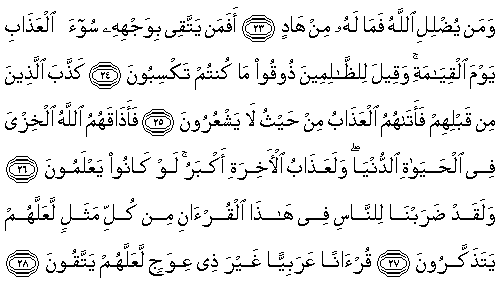 [Zumar 39:1] The revelation of the Book is from Allah, the Most Honourable, the Wise. [Zumar 39:2] We have indeed divinely revealed the Book to you (O dear Prophet Mohammed - peace and blessings be upon him) with the truth, therefore worship Allah, as His sincere bondman. [Zumar 39:3] Pay heed! Worship is for Allah only; and those who have taken others as their supporters beside Him say; “We worship * them only so that they get us closer to Allah”; Allah will surely judge between them regarding the matter in which they dispute; indeed Allah does not guide one who is a big liar, extremely ungrateful. (*The pagans regarded their idols as smaller Gods and worshipped them. So did the Christians. This does not apply to Muslims who only respect their elders, and ask for their blessings.) [Zumar 39:4] Were Allah to create a son * for Himself, He would have chosen any one from His creation! Purity is to Him! He is Allah, the One, the All Dominant. (*Which is impossible.) [Zumar 39:5] It is He Who created the heavens and the earth with the truth; He envelops the night over day and envelops the day over night, and He has subjected the sun and the moon; each one runs for its appointed term; pay heed! He only is the Most Honourable, the Oft Forgiving. [Zumar 39:6] It is He Who created you from a single being, and then from the same being created its spouse, and sent down for you eight pairs of animals; He creates you in your mothers’ wombs, from one sort to another, in a triple darkness; such is Allah, your Lord – for Him only is the kingship; there is no God except Him; so where are you being turned away? [Zumar 39:7] If you become ungrateful, then (know that) indeed Allah is Independent of you; and He does not like the ungratefulness of His bondmen; and if you give thanks, He is pleased with it for you; and no burdened soul will bear another soul’s burden; you have then to return towards your Lord – He will therefore inform you of what you used to do; undoubtedly, He knows what lies within the hearts. [Zumar 39:8] And when some hardship strikes man, he prays to his Lord, inclined only towards Him – then when Allah grants him a favour from Himself, he forgets why he had prayed to Him earlier, and sets up equals to Allah in order to mislead from Allah’s way; proclaim, “Revel in your disbelief for some days; you are indeed of the people of the fire.” [Zumar 39:9] Will he, whose night hours pass in obedience while prostrating and standing, fearing the Hereafter and hoping for the mercy of his Lord, ever be equal to the disobedient? Proclaim, “Are the knowledgeable and the ignorant equal?” It is only the men of intellect who heed advice. Section 2 [Zumar 39:10] Proclaim (O dear Prophet Mohammed - peace and blessings be upon him), “O my bondmen who have accepted faith! Fear your Lord; for those who do good deeds in this world is goodness (in return); and Allah’s earth is spacious; it is the steadfast who will be paid their full reward, without account.” [Zumar 39:11] Say, “I am commanded that I must worship Allah as His sincere bondman.” (And so must you too.) [Zumar 39:12] “And I am commanded that I be the first to submit.” [Zumar 39:13] Say, “Were I to disobey my Lord, I too would fear the punishment of the great Day (of Resurrection).” [Zumar 39:14] Proclaim, “I worship only Allah, as His sincere bondman.” [Zumar 39:15] “Therefore you can worship what you want besides Him!” Say, “The worst losers are those who will lose themselves and their household on the Day of Resurrection; pay heed! This is the plain loss!” [Zumar 39:16] Above them are mountains of fire and beneath them are mountains of fire; Allah scares His bondmen with this; “O My bondmen! Fear Me!” [Zumar 39:17] And those who stayed away from the worship of idols, and inclined towards Allah – for them are glad tidings; therefore give glad tidings to My bondmen. - [Zumar 39:18] Those who heed attentively and follow the best from it; it is these whom Allah has guided, and it is these who have intelligence. [Zumar 39:19] So will the one upon whom the Word of punishment has proved true, ever be equal to those who are forgiven? So will you guide and save the one who deserves the fire? (Because the hearts of some disbelievers are sealed). [Zumar 39:20] But for those who fear their Lord, are the high chambers with more high chambers built above them – rivers flowing beneath them; a promise of Allah; Allah does not renege on His promise. [Zumar 39:21] Did you not see that it is Allah Who sent down water from the sky, and then with it made springs in the earth, and then with it produces crops of various colours, and then it dries up and you see it has become yellow, and He then fragments them into small pieces; indeed in this is a reminder for people of intellect. Section 3 [Zumar 39:22] So will he whose bosom Allah has opened up for Islam - he is therefore upon a light from his Lord - ever be equal to one who is stone hearted? Therefore ruin is for those whose hearts are hardened towards the remembrance of Allah; they are in open error. [Zumar 39:23] Allah has sent down the best of Books (the Holy Qur’an), which is consistent throughout, the one with paired statements; the hairs on the skins of those who fear their Lord, stand on end with it; then their skins and their hearts soften, inclined towards the remembrance of Allah; this is the guidance of Allah, He may guide whomever He wills with it; and whomever Allah sends astray, there is no guide for him. [Zumar 39:24] So will he who will not have a shield except his own face against the wretched punishment on the Day of Resurrection, ever be equal to one who is forgiven? And it will be said to the unjust, “Taste what you have earned!” [Zumar 39:25] Those before them had denied, therefore the punishment came to them from a place they did not know. [Zumar 39:26] So Allah made them taste humiliation in the life of this world; and indee