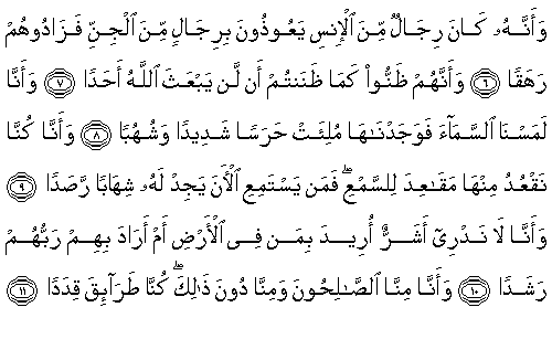 [Jinn 72:1] Proclaim (O dear Prophet Mohammed - peace and blessings be upon him), “I have received the divine revelation that some jinns attentively listened to my recitation, so they said, ‘We have heard a unique Qur’an.’ [Jinn 72:2] ‘That guides to the path of goodness, we have therefore accepted faith in it; and we shall never ascribe anyone as a partner to our Lord.’ [Jinn 72:3] ‘And that our Lord’s Majesty is Supreme - He has neither chosen a wife nor a child.’ [Jinn 72:4] ‘And that the fool among us used to utter false exaggerations against Allah.’ [Jinn 72:5] ‘Whereas we had thought that men and jinns would not never fabricate a lie against Allah!’ [Jinn 72:6] ‘And indeed some men among humans used to take the protection of some men among jinns, so it further increased their haughtiness.’ [Jinn 72:7] ‘And that they assumed, like you humans assume, that Allah would not send any Noble Messenger.’ [Jinn 72:8] ‘And we reached the sky, so we found it strongly guarded and filled with comets.’ [Jinn 72:9] ‘And that we sometimes used to sit in some places in the sky, to listen; so whoever now listens finds a fiery comet waiting for him.’ [Jinn 72:10] ‘And we do not know whether harm is intended for those on the earth, or whether their Lord intends goodness for them.’ [Jinn 72:11] ‘And among us some are virtuous and some are the other type; we are split into several branches.’ [Jinn 72:12] ‘And we are certain that we cannot defeat Allah in the earth, nor can we run out of His grasp.’ [Jinn 72:13] ‘And that when we heard the guidance, we accepted faith in it; so whoever accepts faith in his Lord, has no fear - neither of any loss nor of any injustice.’ [Jinn 72:14] ‘And that some among us are Muslims and some are the unjust; and whoever has accepted Islam – it is they who have thought rightly.’ [Jinn 72:15] ‘And as for the unjust - they are the fuel of hell.’ ” [Jinn 72:16] And proclaim (O dear Prophet Mohammed - peace and blessings be upon him), “I have received the divine revelation that ‘Had they remained upright on the straight path, We would have given them abundant water.’ [Jinn 72:17] ‘In order to test them with it; and whoever turns away from the remembrance of his Lord – He will put him in a punishment that keeps on increasing.’ [Jinn 72:18] ‘And that the mosques are for Allah only – therefore do not worship anyone along with Allah.’ [Jinn 72:19] ‘And that when Allah’s bondman stood up to worship Him, the jinns had almost crowded upon him.’ ” Section 2 [Jinn 72:20] Say (O dear Prophet Mohammed - peace and blessings be upon him), “I worship only Allah, and I do not ascribe any partner to Him.” [Jinn 72:21] Proclaim (O dear Prophet Mohammed - peace and blessings be upon him), “I am not the master of any harm or benefit for you.” [Jinn 72:22] Say, “No one will ever save me from Allah, and other than Him, I will not find any refuge.” [Jinn 72:23] “I only convey the commands from Allah, and His messages; and whoever disobeys the commands of Allah and His Noble Messenger – then indeed for him is the fire of hell, in which they will remain for ever and ever.” [Jinn 72:24] Till the time when they will see what they are promised - so they will now come to know whose aide is weak, and who is lesser in number. [Jinn 72:25] Say (O dear Prophet Mohammed - peace and blessings be upon him), “I do not know whether what you are promised is close or if my Lord will postpone it for a while.” [Jinn 72:26] The All Knowing of all the hidden does not give anyone the control over His secrets. [Jinn 72:27] Except to His chosen Noble Messengers – so He appoints guards in front and behind him. (Allah gave the knowledge of the hidden to the Holy Prophet – peace and blessings be upon him.) [Jinn 72:28] In order to see that they have conveyed the messages of their Lord – and His knowledge encompasses all whatever they have, and He has kept all things accounted for. |